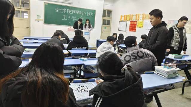 为了增添校园风采,丰富同学们的课余时间的文化生活,培养个人静心思考的能力,锻炼同学们的逻辑思维能力。学院团委于12月12日在图文楼507举办了五子棋比赛活动。此次活动共有100余名同学参加。