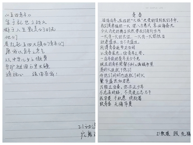 同学们在充分了解五四青年节的历史基础上以诗歌的形式写下自己内心的感悟,通过优秀的作品,展现出同学们的风采和智慧,把自己的写作逻辑思维,表达能力,在活动中展现的淋漓尽致。