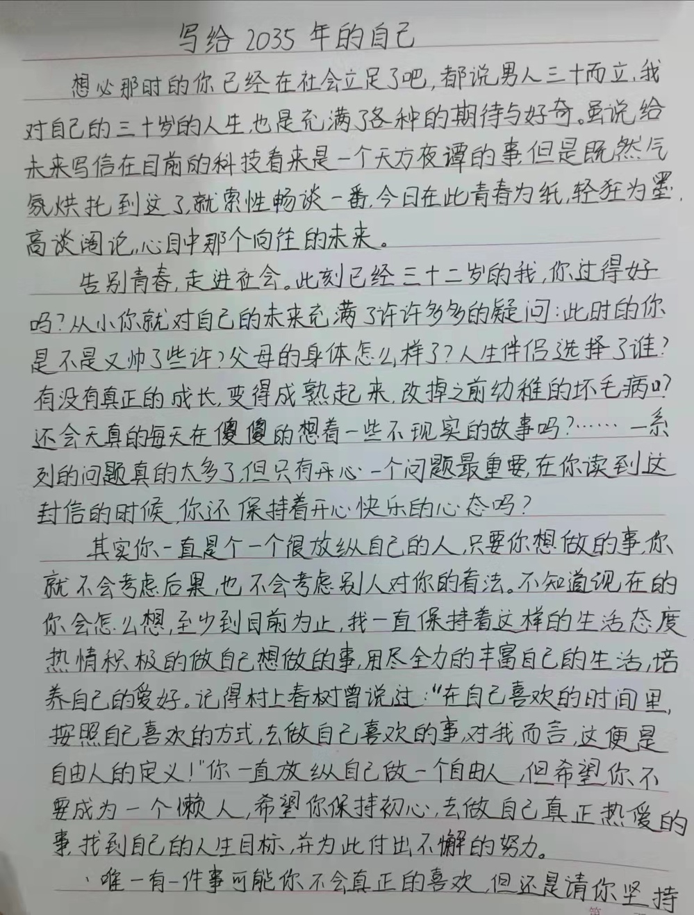 征文中,同学们描绘出了对未来的期盼,憧憬着未来的生活,珍惜现在的美好,表示要把小我融入大我、融入中华民族伟大复兴征程的远大理想,坚定“强国必定有我”的信念,只争朝夕,不负韶华,履行好“请党放心,强国有我”的庄严承诺,