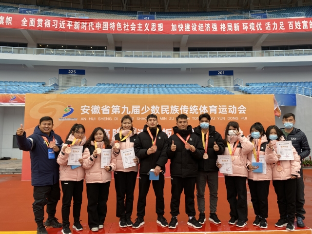 本届运动会为安徽省第九届少数民族体育运动会,赛程5天,从11月25日至29日在滁州市举行,设武术、民族式摔跤、毽球、高脚竞速、板鞋竞速、陀螺、押加、蹴球8个竞赛项目和民族健身操表演项目,来自全省16个代表团、800多名运动员将展开各类奖项的角逐。beat365热夏提·木沙江、木艾热木·托乎提等11位少数民族学生代表铜陵市参加了运动会。其中男子押加项目85kg+以上级取得银牌,男子押加项目61kg级,女子板鞋竞速2x100米接力项目取得铜牌,2名学生荣获“道德风尚奖”。