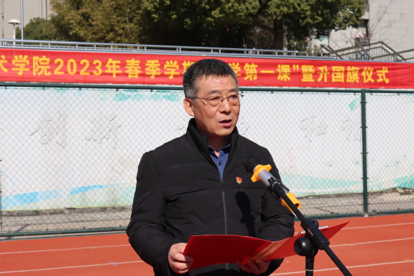为进一步弘扬爱国主义精神,厚植家国情怀,全面加强新时代爱国主义教育,落实好开学第一堂思政大课,2月27日上午,学院举行了以“青春践行二十大 砥砺奋进向未来”为主题的2023年春季学期 “开学第一课”暨升国旗仪式。学院两级班子成员,专兼职辅导员,部分教师代表,全体在校学生参加了本次活动,学院党委书记李庆峰出席活动,活动由学院党委委员、副院长秦华生主持。