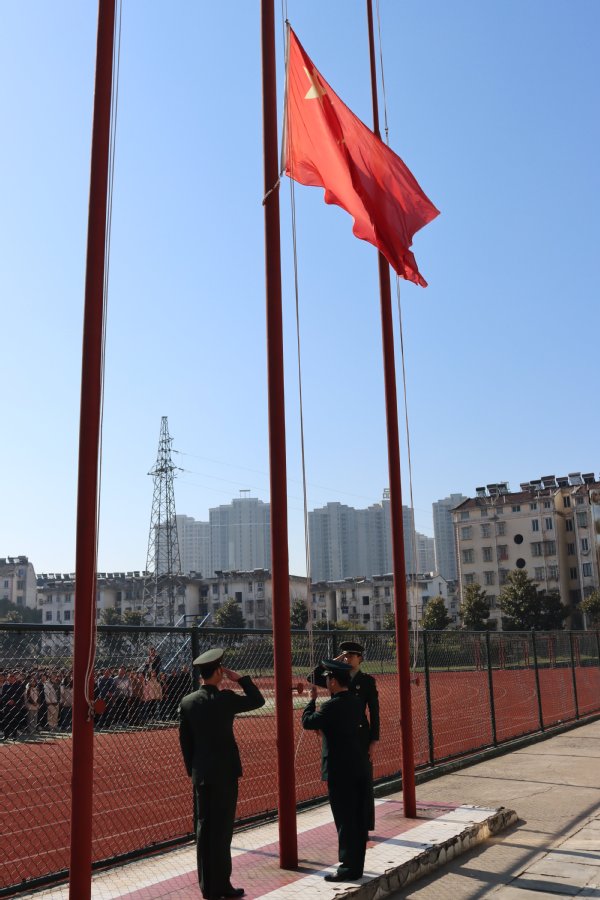 9时40分,在雄壮激昂的国歌声中,鲜艳的五星红旗冉冉升起,全体师生肃立,一同面向国旗行注目礼,表达对伟大祖国的热爱与敬意。