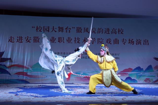 随着鼓点响起,戏曲表演正式开始。合肥市庐剧院的艺术家们为学院师生呈现了一台精彩纷呈的戏曲文化盛宴,演唱曲目《盗仙草》、《断桥》取材于民间传说“白蛇传”,包含的主题内容被艺术家们用精湛的演技表现得淋漓尽致,让观众们零距离感受了庐剧的魅力。演出持续近两个小时,整场高潮迭起、精彩不断,艺术家们婉转悠扬的唱腔、惟妙惟肖的表演、丰富传神的表情让师生们近距离地感受到传统文化的魅力,享受了一场传统与现代交织的文化视听盛宴。