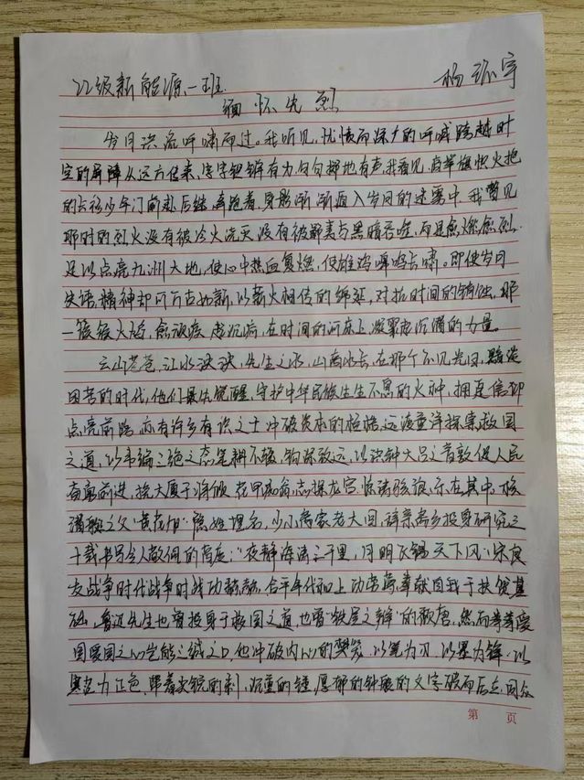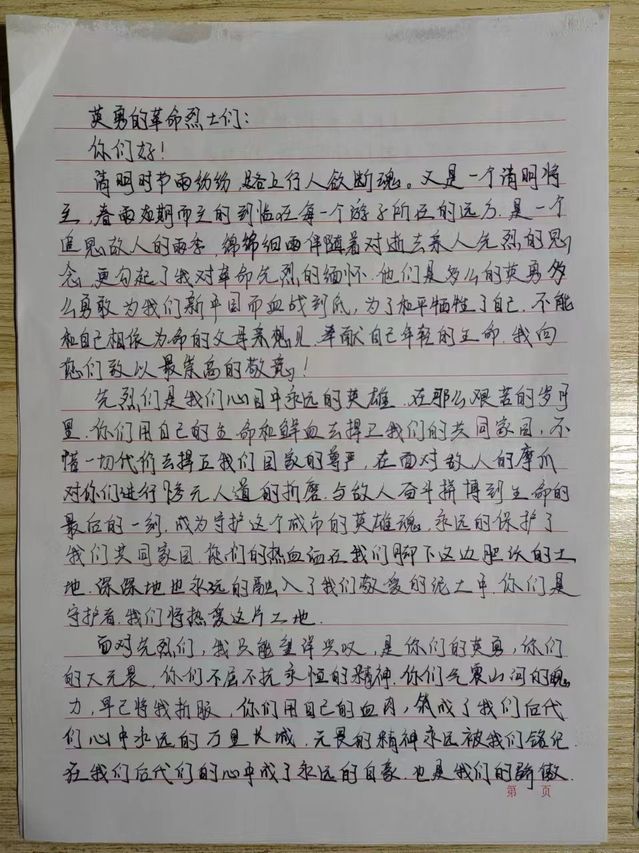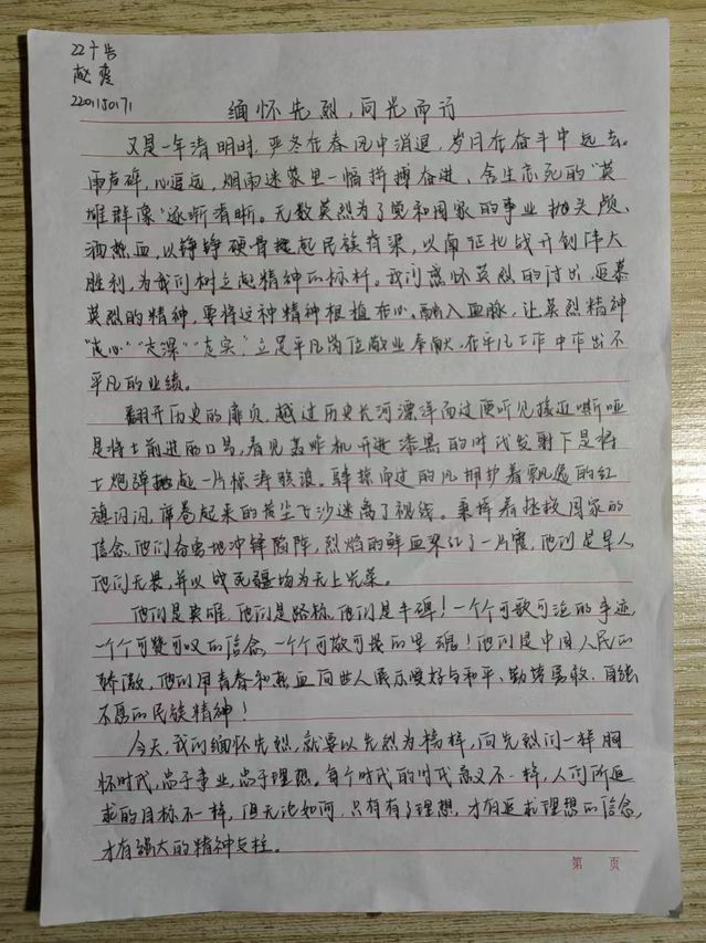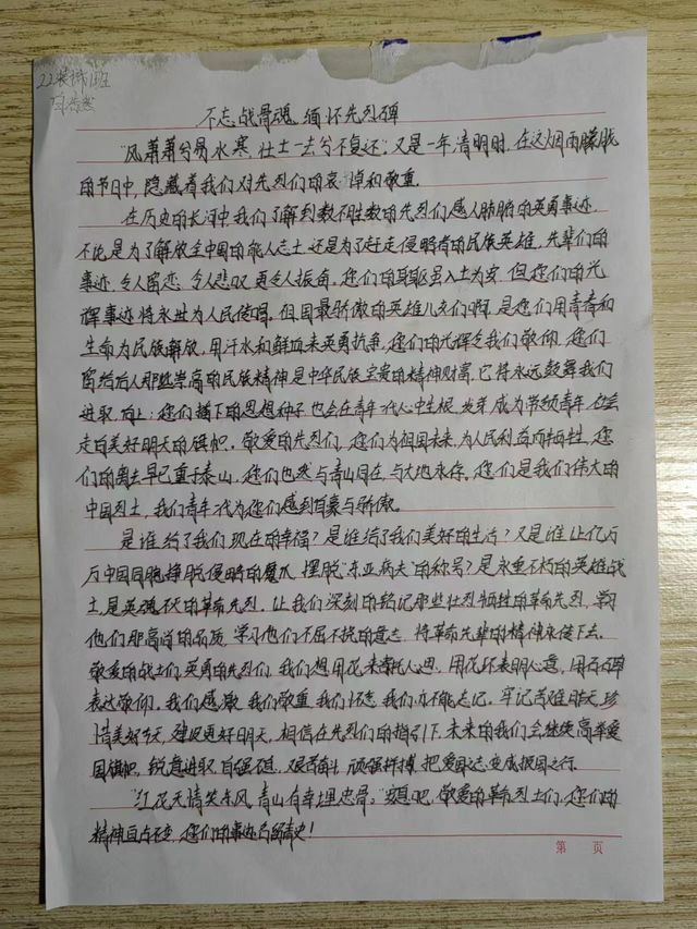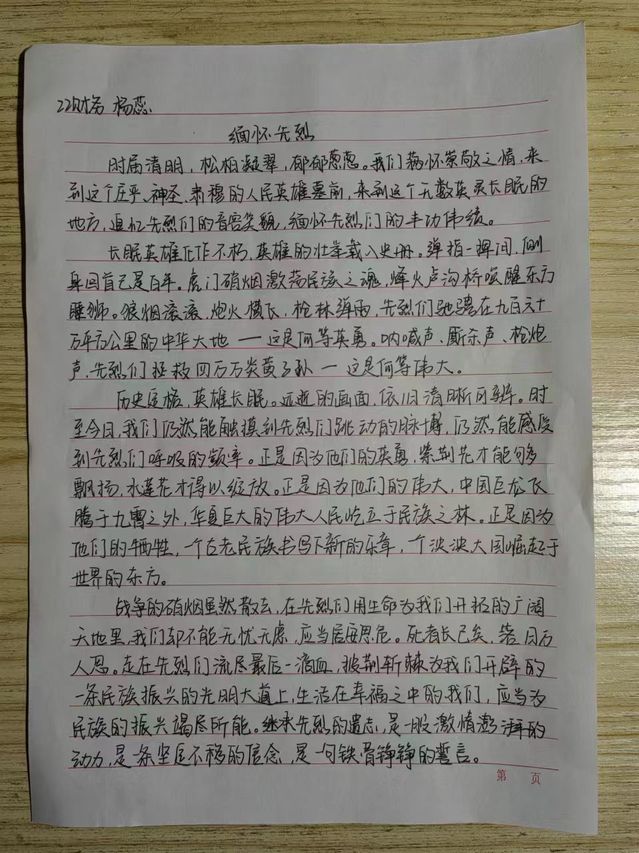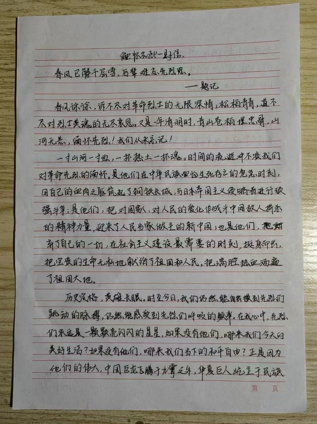 此次活动中,同学们通过搜集先烈们更深入的事迹资料,再结合自己崇高的敬佩之心和满腔的爱国之情,写下了一篇篇优秀的作品。字里行间可以看出同学们对国家,对先烈的深深敬佩之情,让那些为国所牺牲的烈士永远不会被遗忘。