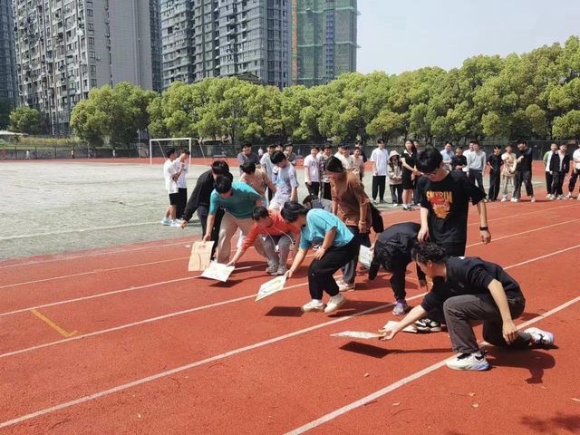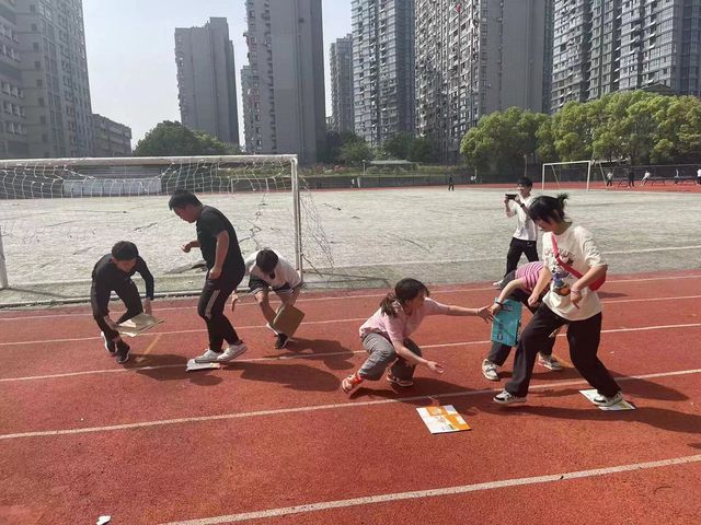 活动中,同学们通过三人一组,一人在纸板上行走,两人配合的形式完场活动,通过三人的默契配合,不断地超越对手,追求第一,最终取得比赛的胜利。