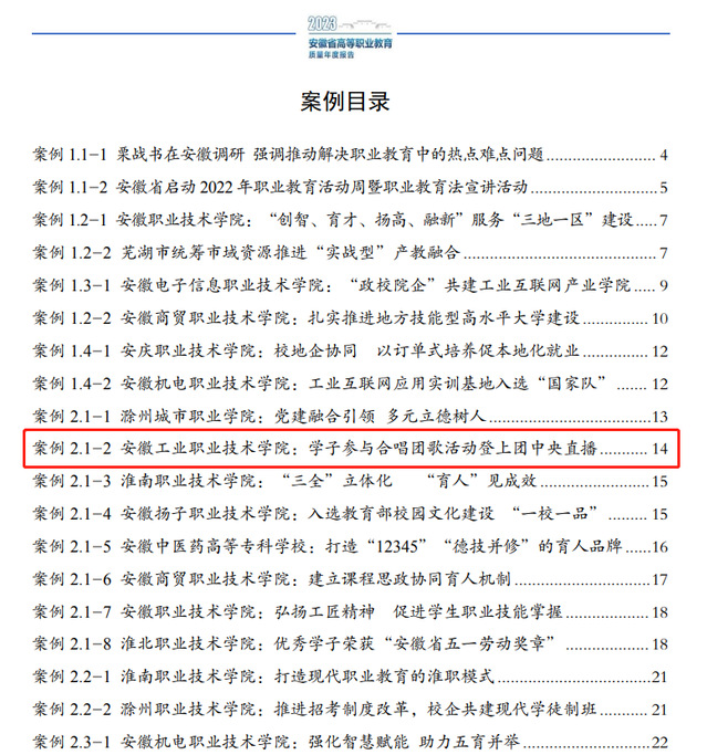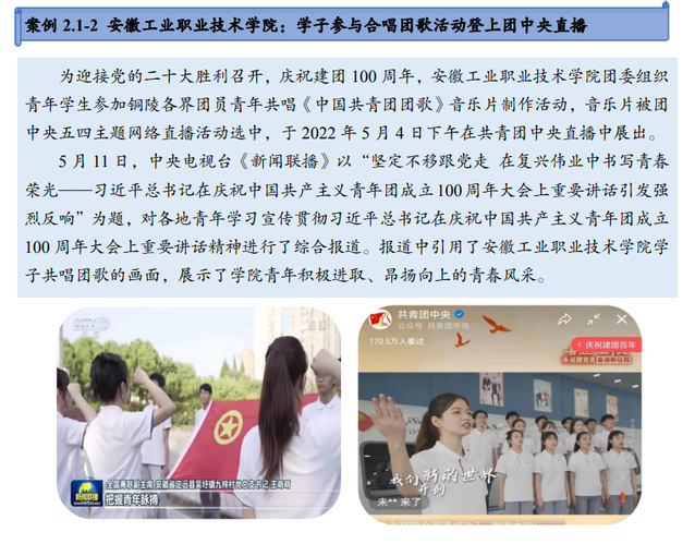 近日,在安徽省教育厅网站上公布的《2023安徽省高等职业教育质量年度报告》中,我院《学子参与合唱团歌活动登上团中央直播》工作案例成功入选!祝贺!