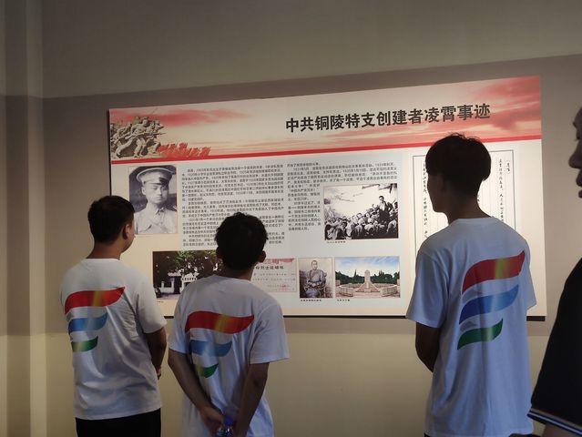 在中共铜陵特支展览馆,实践队员首先参观了馆内珍贵的展出文件资料、物品,了解到这是中国共产党在铜陵境内建立的第一个党支部,由此点燃了铜陵地区的燎原星火,书写了党领导铜陵人民进行反帝反封建革命斗争的新篇章,是铜陵革命史上红色的起点。实践队员认真观看党史图片、实物展台,缅怀革命先烈,面对党旗,进行了庄严宣誓。