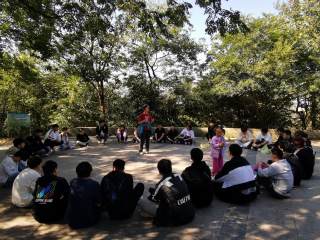 在笔架山的平台休憩处,社员们利用休息时间进行团建“破冰”活动,社团指导教师首先跟同学们介绍了社团的总体情况,以及护林团建的初衷,社员们轮流作了自我介绍,并且在大家的提议下合唱了歌曲《强军战歌》,铿锵有力的歌声响彻笔架山顶。