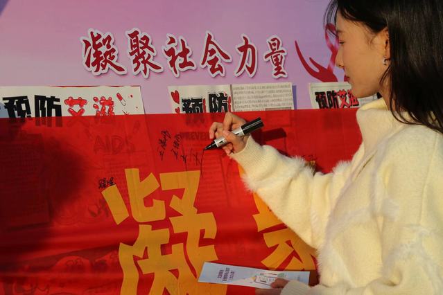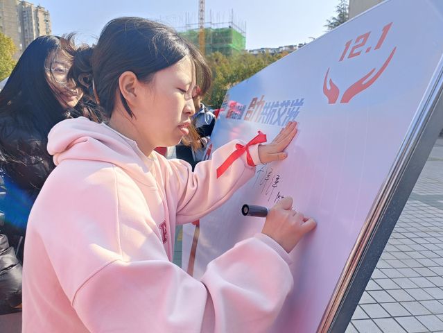 活动中,志愿者提前准备好红丝带,签字板,横幅以及红丝带胸针,并组织好同学们,佩戴红丝带与红丝带胸针,在负责人进行宣传后,让同学们排队在签字板上写下自己的名字以及对此次防艾活动的寄语。