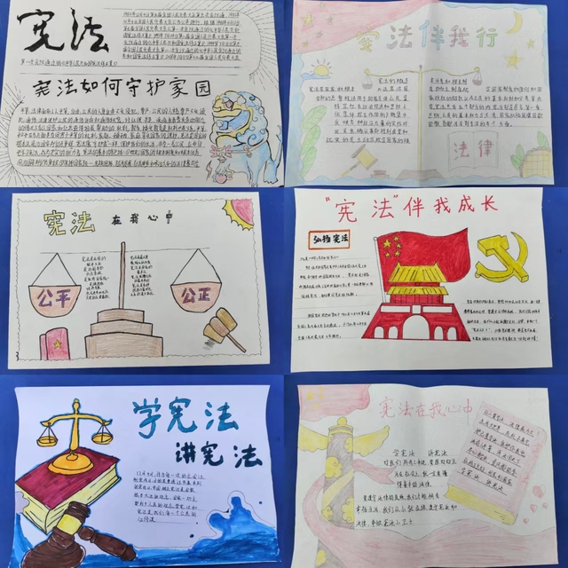 在活动中,同学们主动收集和学习宪法知识、法治故事等,积累了大量素材,制作过程中充分发挥想象力,将相关法律条文和案例故事以图文并茂的形式展示出来,一张张小报凝聚了同学们的思考和创造,是法治文化与艺术作品的融合,既有知识性又有趣味性,体现了孩子们尊重宪法、敬畏宪法、热爱宪法的赤子情怀。