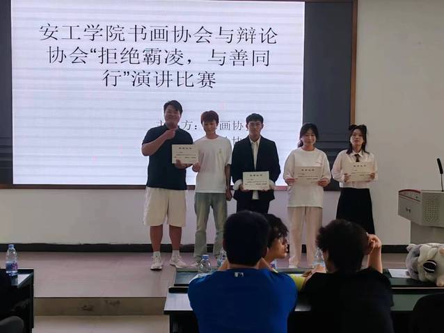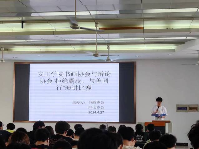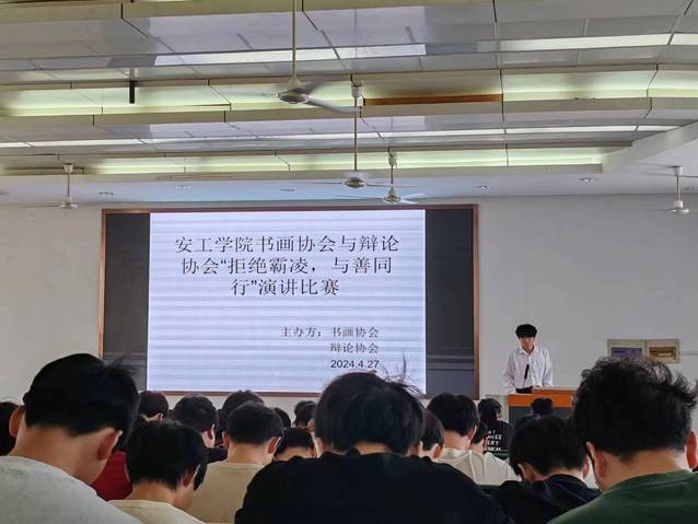 为切实保障同学们身心健康和合法权益,防治校园欺凌。 4月27日下午两点,演辩协会与书画协会在阶梯教室101联合举行了一场意义非凡的演讲比赛,演讲主题是《拒绝霸凌,与善同行》。