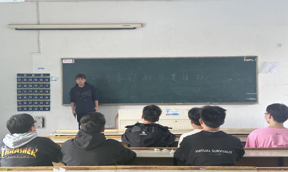 活动结束后,同学们完成签到后有序退场。此次活动给我们带来的意义是让同学们对各种矿物按一定的科学体系做划分和归类的方法,让同学们深入了解矿石这一特殊的自然资源,同学们应该认真学习充满斗志向着自己的目标前进。为了让同学们了解更多的专业知识,更好的认识矿石标本,提高动手能力,物华标本社团于2024年5月6日上午在教学楼402开展“矿物分类”活动。