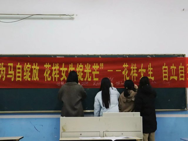 活动最后,同学们在横幅上留下了自己的笔记和签名,并合影留念。这一瞬间定格了她们的笑容和自信,也见证了她们在“花样女生,自立自强”活动中的成长与收获。