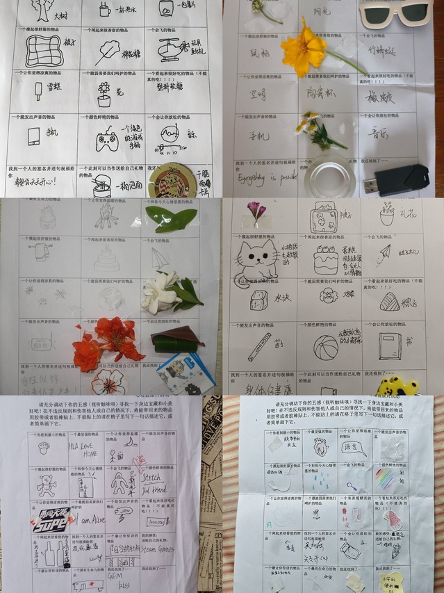 “五感寻幸福”搜集活动成为本次心理健康月的创新亮点。学生们手持特制手册,通过“寻找会飞的物品”“记录闻起来香甜的瞬间”等15个趣味任务,用视觉捕捉校园光影、用触觉感受草木纹理、用文字记录味觉记忆。活动回收的近百份手册中,既有粘贴着合欢花、奶茶杯贴纸的“实物宝藏”,也有“毛茸茸的小猫咪”“雨后青草香”等细腻文字描绘。特别设置的“送给自己的礼物”反思栏,更让学生在探索外在美好的同时,学会关照内心需求,实现个人疗愈与集体温暖的双向传递。 在教学楼大厅,“情绪大转盘”互动展板吸引了众多学生驻足。展板以“觉察-命名-接纳-调节-行动”五步法为核心,结合可旋转的“情绪应对策略”装置,将抽象的心理学知识转化为“数呼吸法”“优势日记”等具体操作。“原来愤怒时可以通过写‘情绪信’释放!”“转动转盘像开盲盒一样有惊喜”——同学们的反馈印证了活动的实效性,让情绪管理从理论走向可感知、可操作的日常实践。