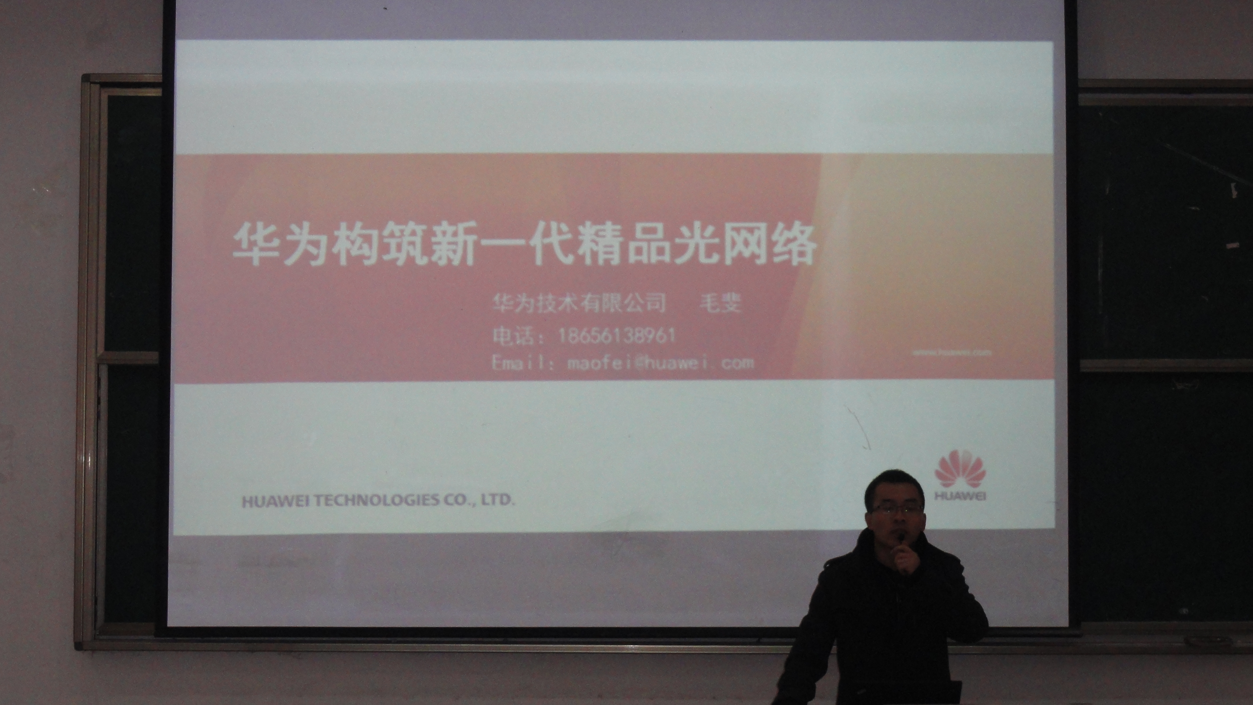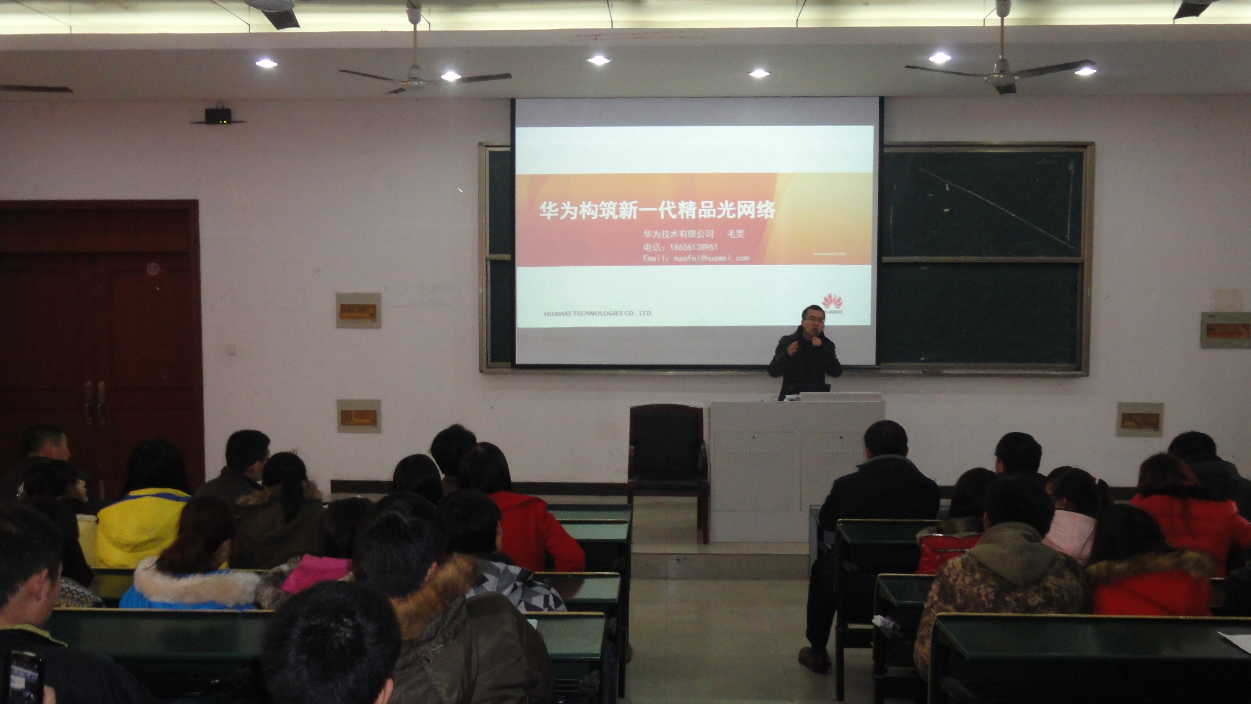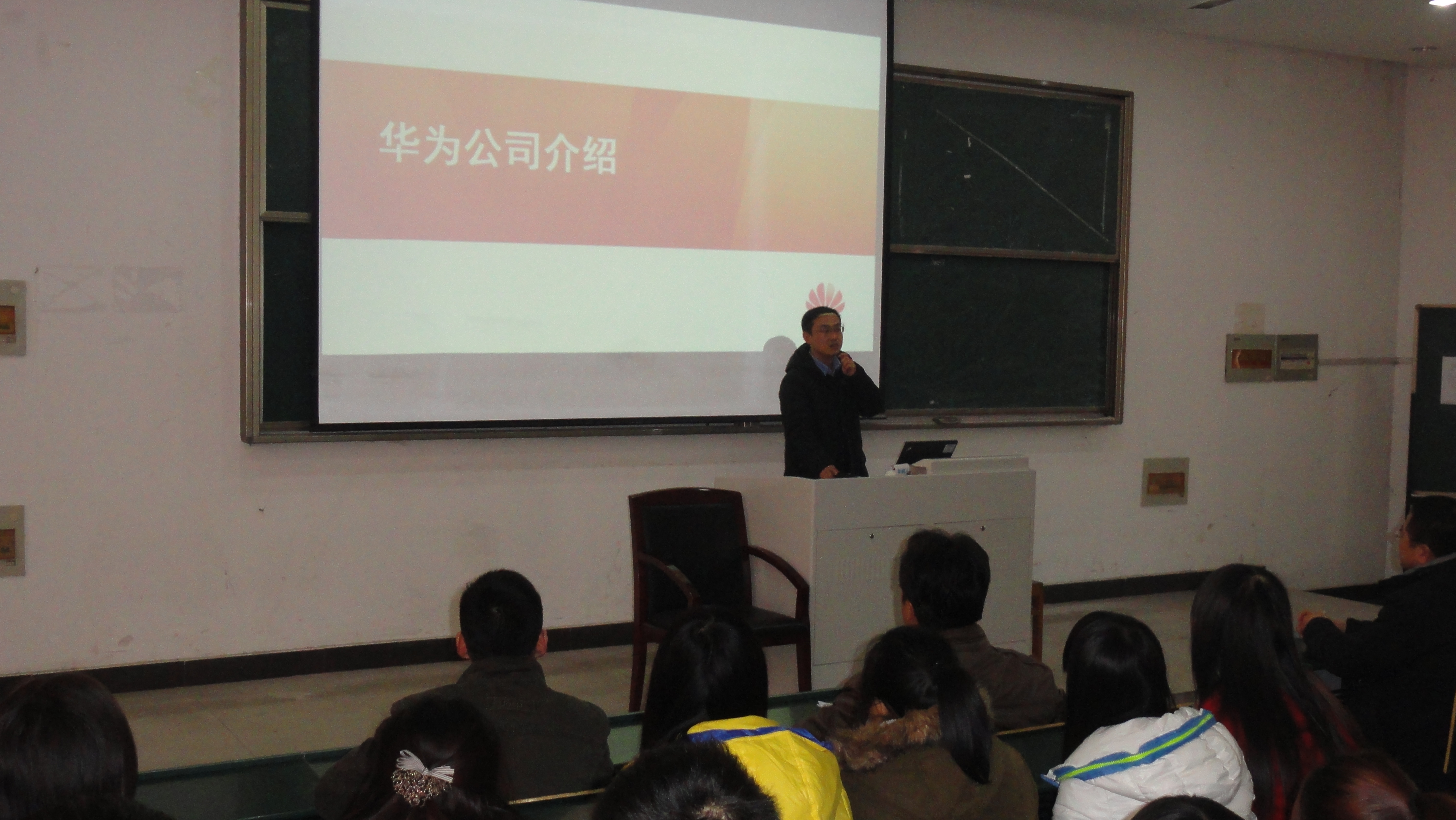 12月23日下午,网络技术专业的师生早早来到教学楼101阶梯教室里,安静的等待工程师的到来。2:30讲座正式开始,刘志峰工程师首先介绍了目前华为网络有限公司的基本情况和主营业务,接着介绍了公司的主要网络产品和核心交换机等网络设备;毛斐工程师详细介绍了华为公司的骨干光纤网络技术;最后合肥龙旭网络技术有限公司的金哲龙总经理给同学们介绍了目前网络技术专业的就业现状及职业规划。