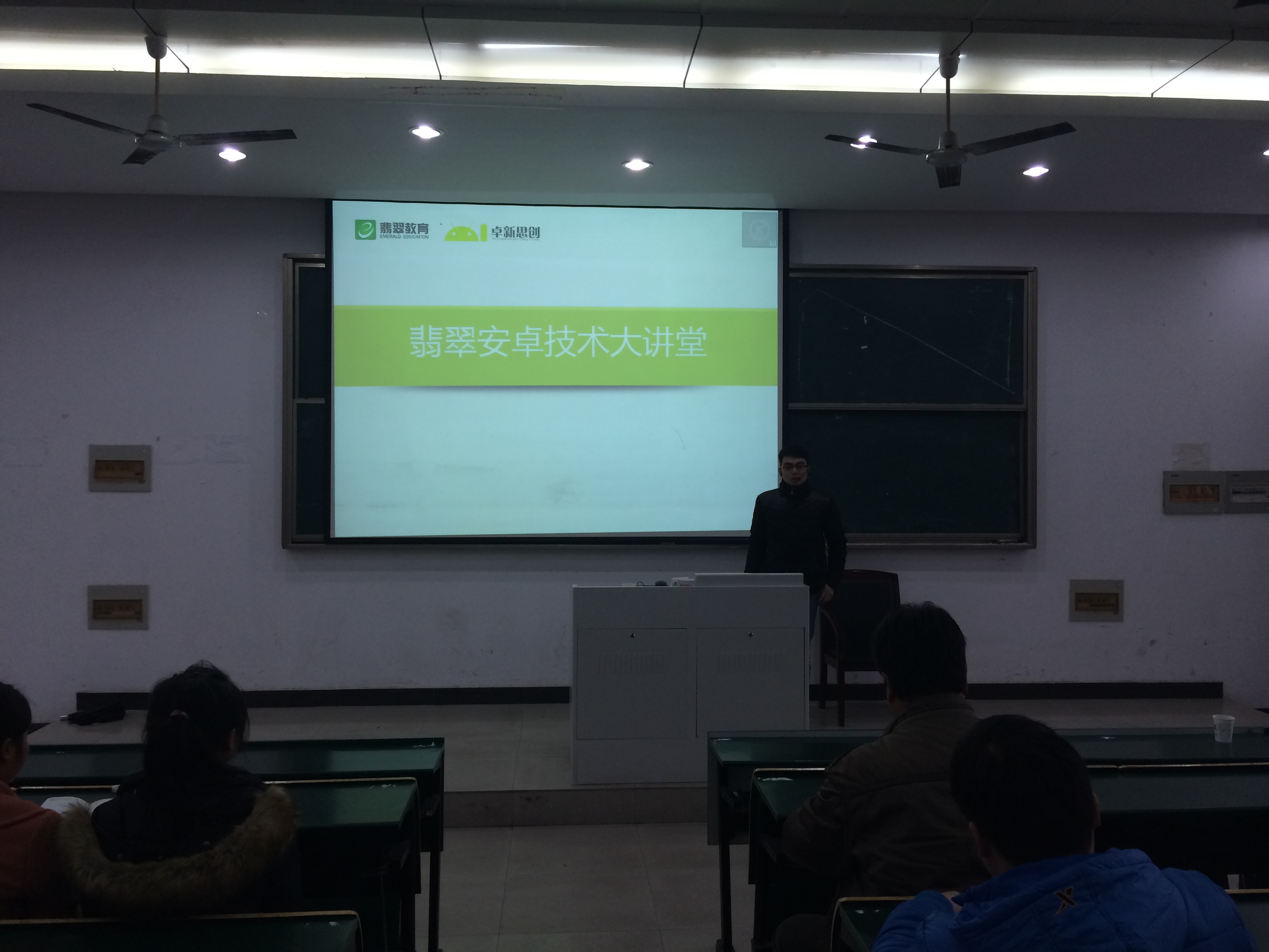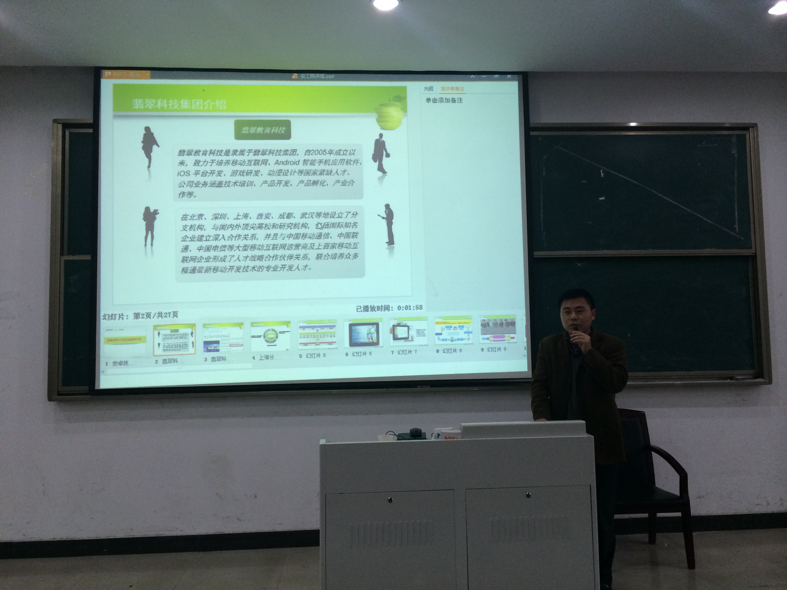 讲座于2月28日下午3:00在教学楼101阶梯教室准时开始,在信息工程系庄城山副主任的主持下,翡翠科技的褚诗伟讲师首先介绍了我国移动互联网和手机安卓平台发展的历史,重点对当前安卓技术的应用现状和市场对安卓技术人才的岗位、能力需求进行详细的分析和总结。随后翡翠科技的韩树金总监为同学们介绍了翡翠科技移动互联网产业联盟的运营模式和状况,以及安卓技术的培训方案,对有兴趣再学习的同学与院校合作实施订单式培养。