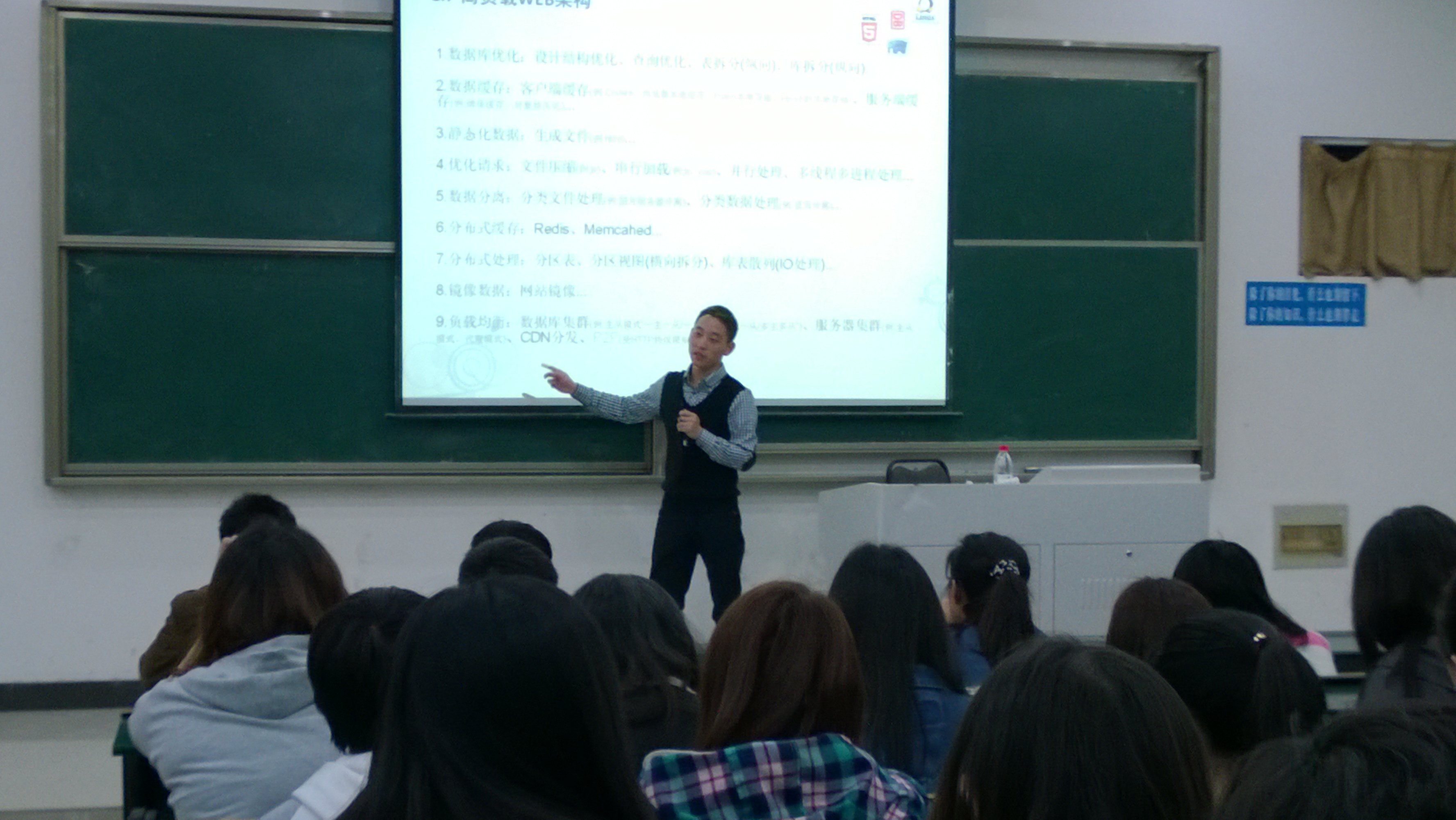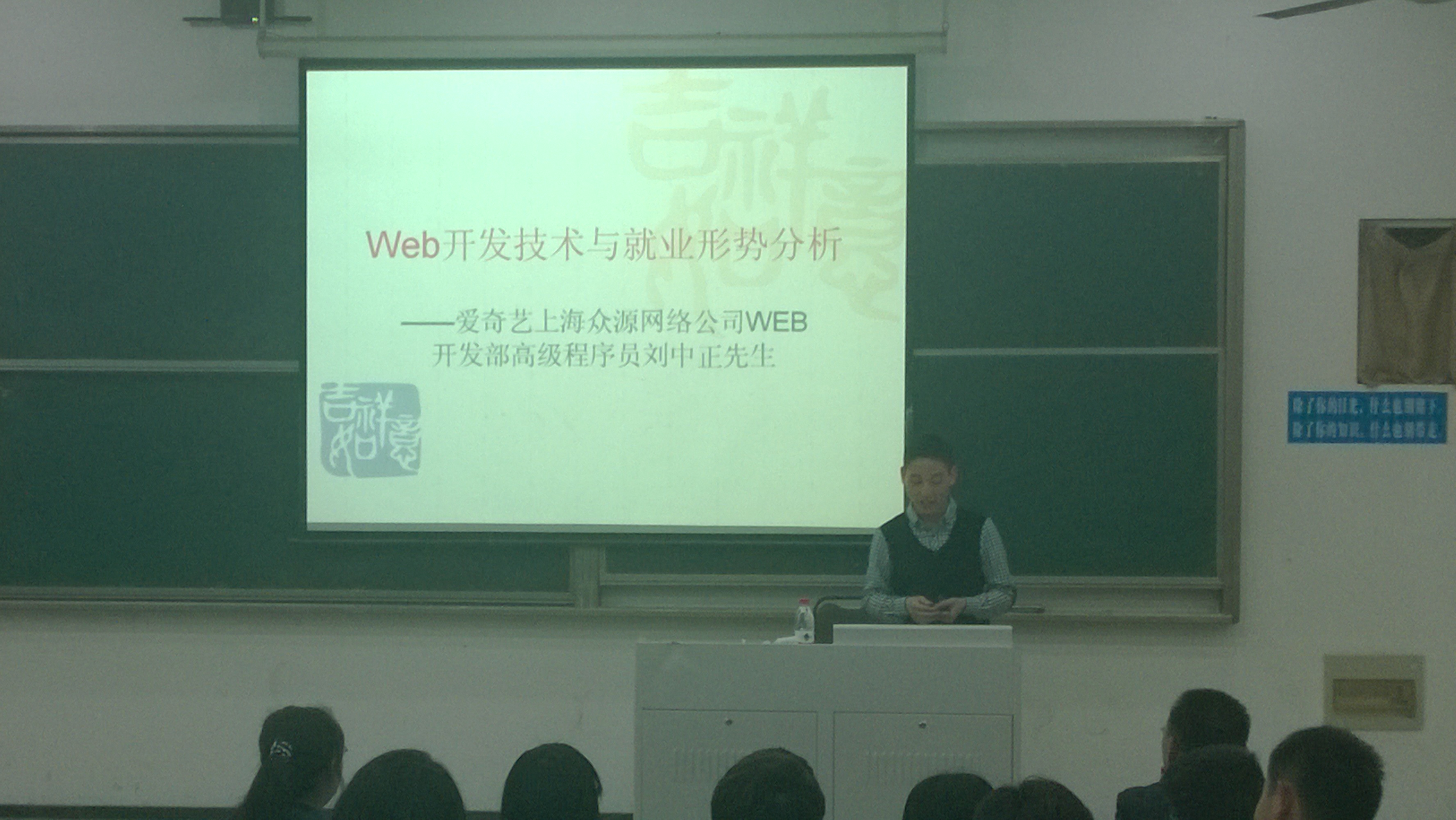 为了增强信息工程系计算机应用、软件专业学生的学习WEB开发技术的兴趣,了解相关的就业市场的需求情况,信息工程系07级校友——爱奇艺上海众源网络有限公司,技术产品中心研发部WEB组高级程序员刘中正工程师返校为12级、13级计算机应用、软件专业的学生举办了一场以“WEB开发技术介绍及就业形式分析”为主题的专业知识讲座。