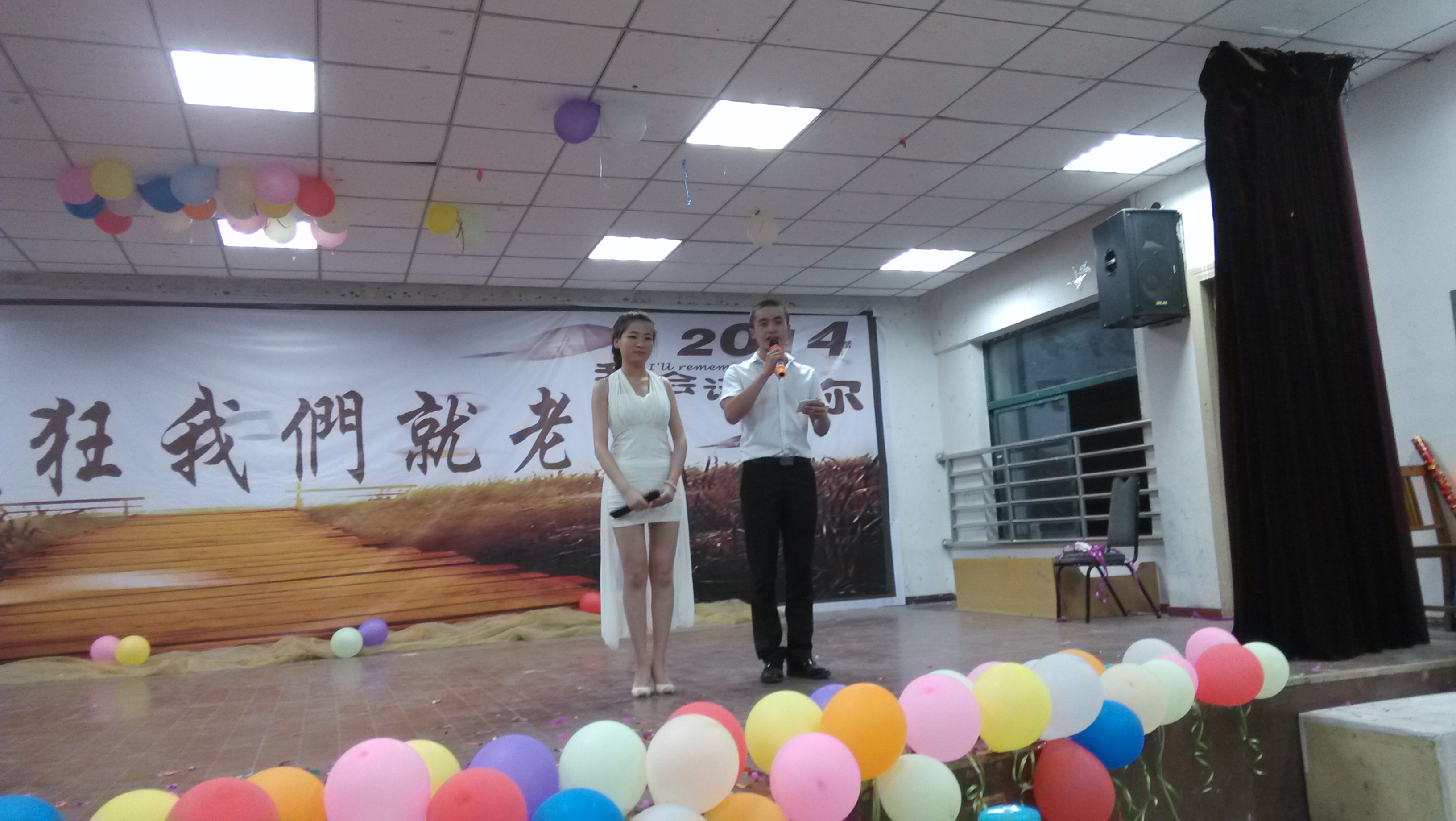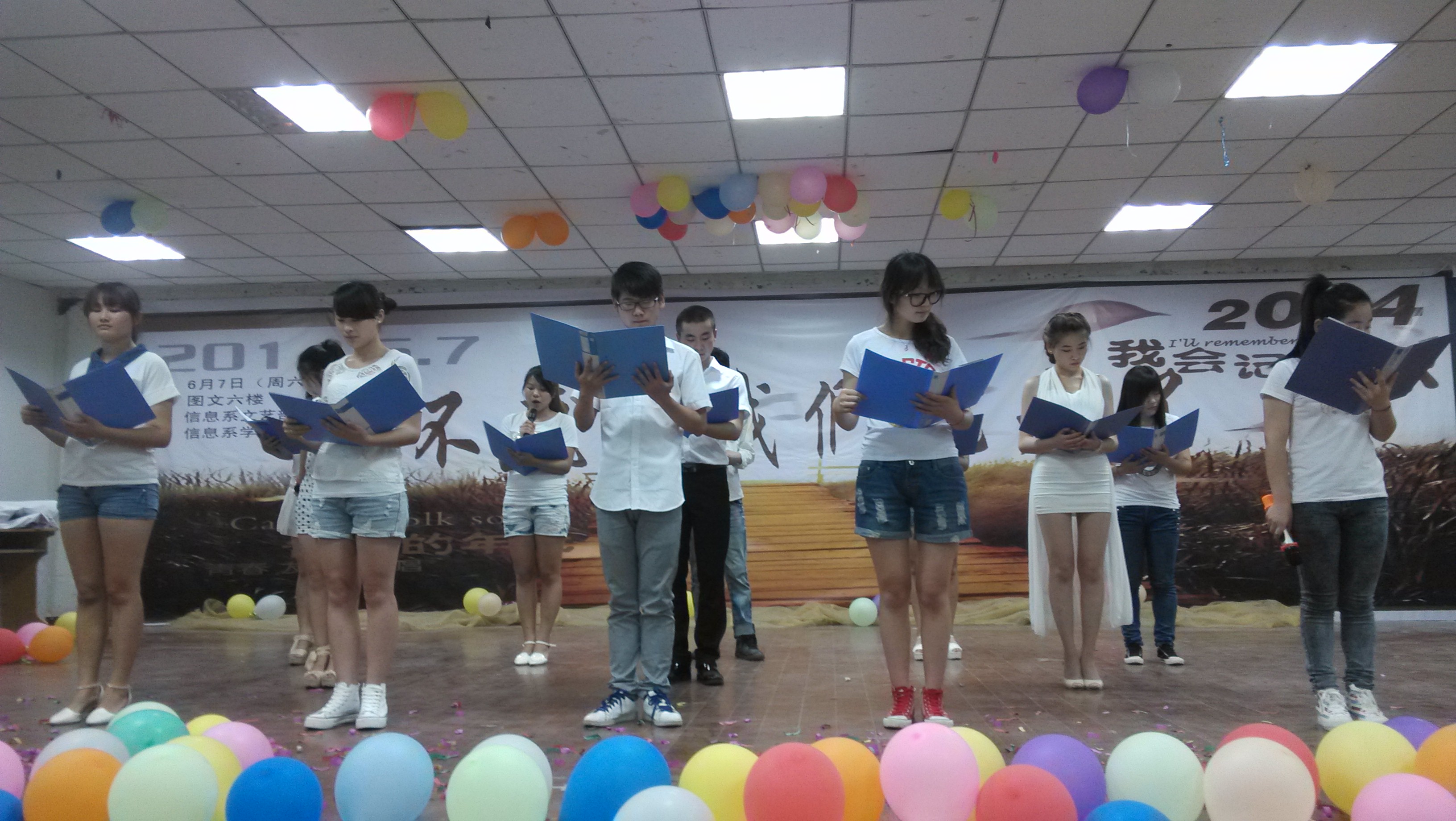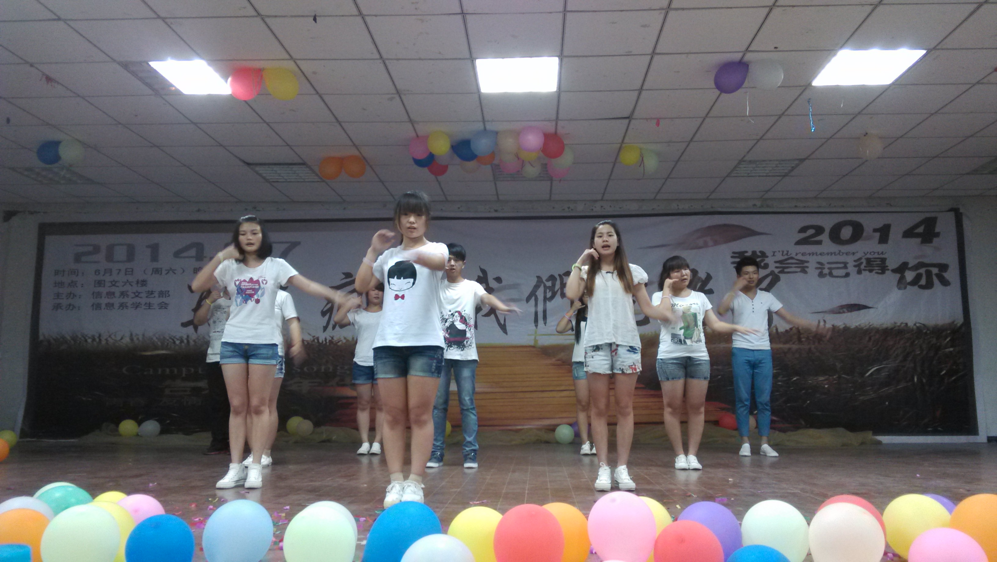 在2014年6月7号晚上7:00,图文楼学生活动室气氛异常热烈,这里正在举办了一场“再不疯狂,我们就老了”的主题晚会。本次晚会既是信息系学生会八个部门的联欢晚会,也是送老生毕业离校晚会。晚会节目丰富,有炫丽的舞蹈,动听的歌曲,令人深思的小品。晚会不光有精彩的节目还有精美互动礼品,有奖问答。让同学们不仅能看到精彩的节目,还能玩的开心。