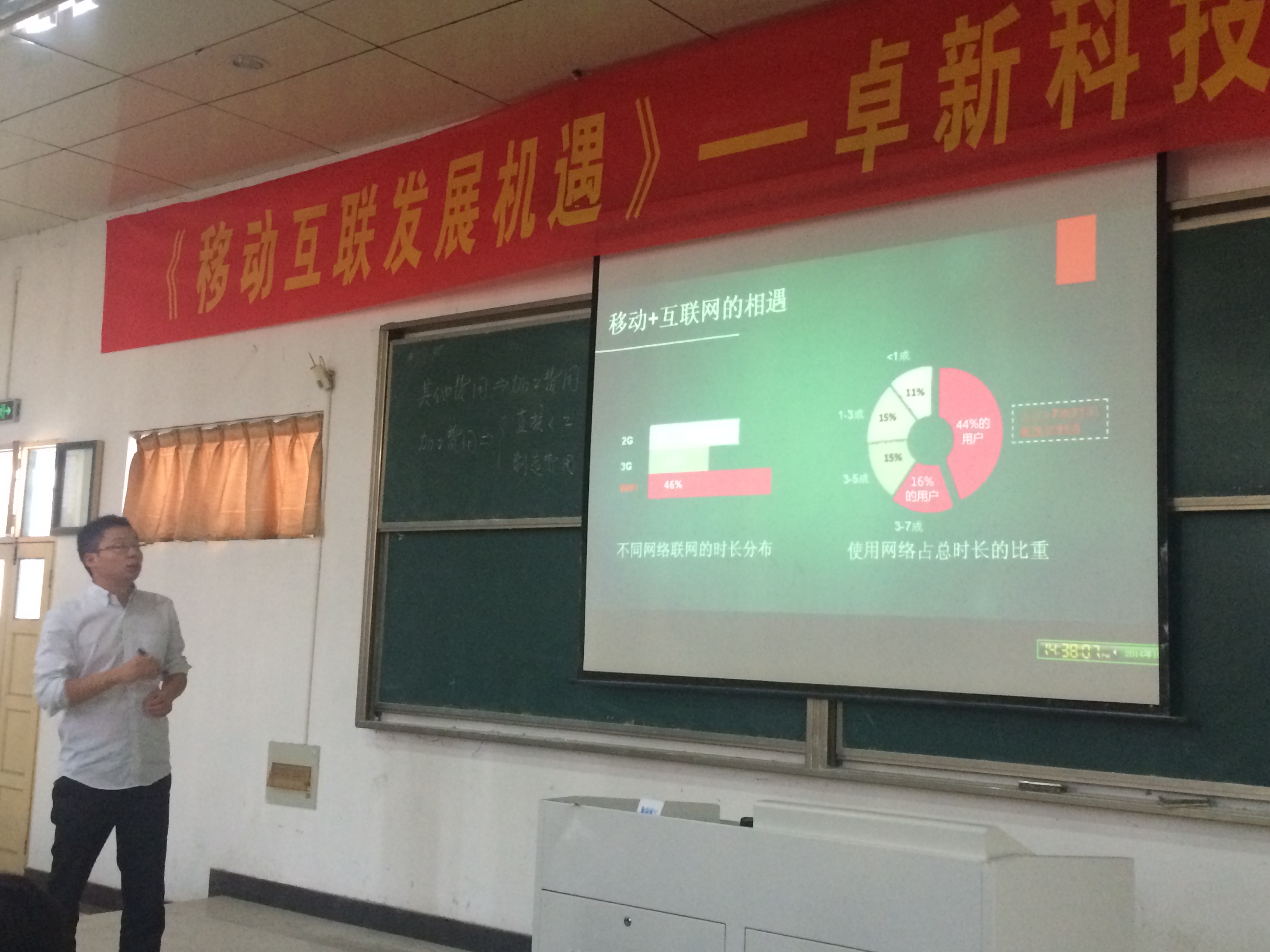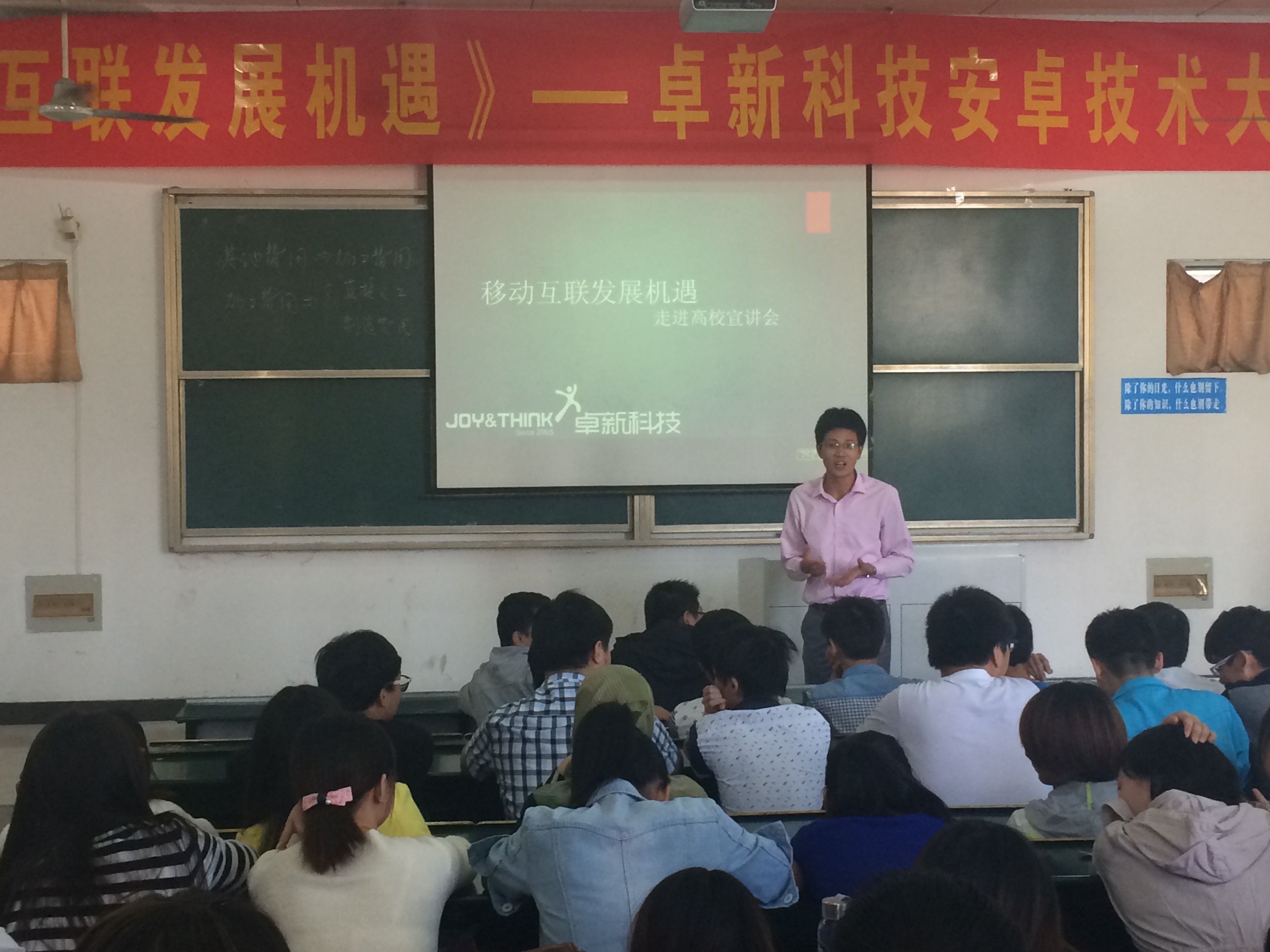 讲座于10月24日下午14:30在教学楼103阶梯教室准时开始,在信息工程系王光亚老师的主持下,卓新科技的高级项目经理许成才首先介绍了我国安卓技术及发展,重点对当前安卓技术的应用现状和市场对安卓技术人才的岗位、能力需求进行详细的分析和总结。随后卓新科技的市场部经理余可涛为同学们介绍了移动物联网企业联盟人才定制,以及安卓技术的培训方案,对有兴趣再学习的同学与院校合作实施订单式培养。