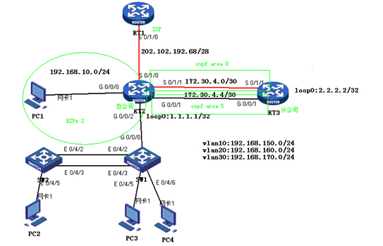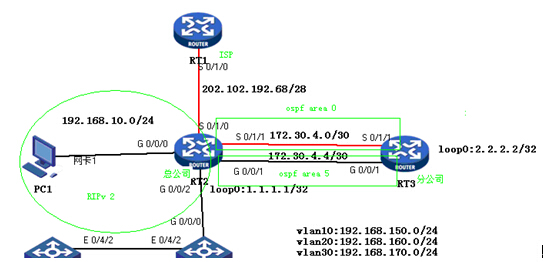 l 在总部路由器上的RIP协议中OSPF路由与直连路由,在总部路由器的OSPF协议中引入直连路由和RIP路由。(10’)