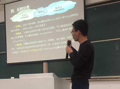 云计算技术是当前网络技术重要的发展方向之一。但目前beat365网络技术专业尚未开设相关课程。为拓展学生的视野,了解网络技术行业最新发展趋势。2017年4月21日下午下午,赛博社团请到beat365网络技术专业教研室主任周跃老师在学院阶梯教室102,为同学们做了一场“云计算基础知识”的讲座。一个多小时的讲座,现场座无虚席,同学们展现了对新知识、新技术的渴求。周老师从云计算基本概念,云计算起源发展及相关应用给同学们做了一场精彩的讲座。