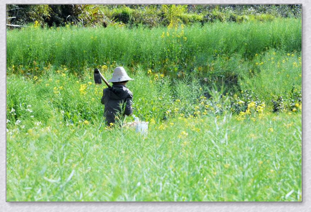 作品简介:务农的老爷爷背着锄头乘着春意盎然的天去自家的田地里耕种。