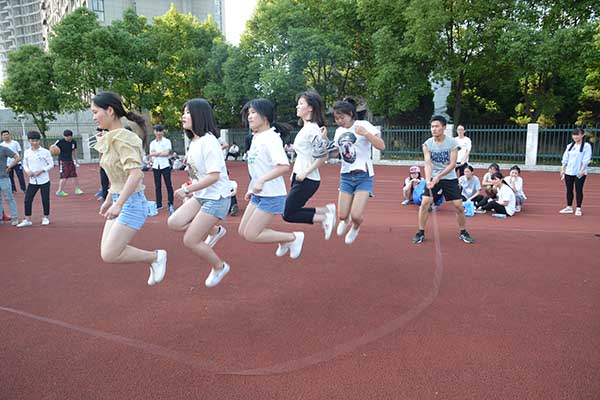 趣味项目包括:拔河比赛,集体跳绳,个人跳绳,两人三足接力赛。参与其中的同学们可谓是热情高涨、竭尽全力,旁边加油助威的同学则时不时的会有笑声传出,场面非常热闹,但是却很有秩序,充分的体现出身为大学生该有的素质。