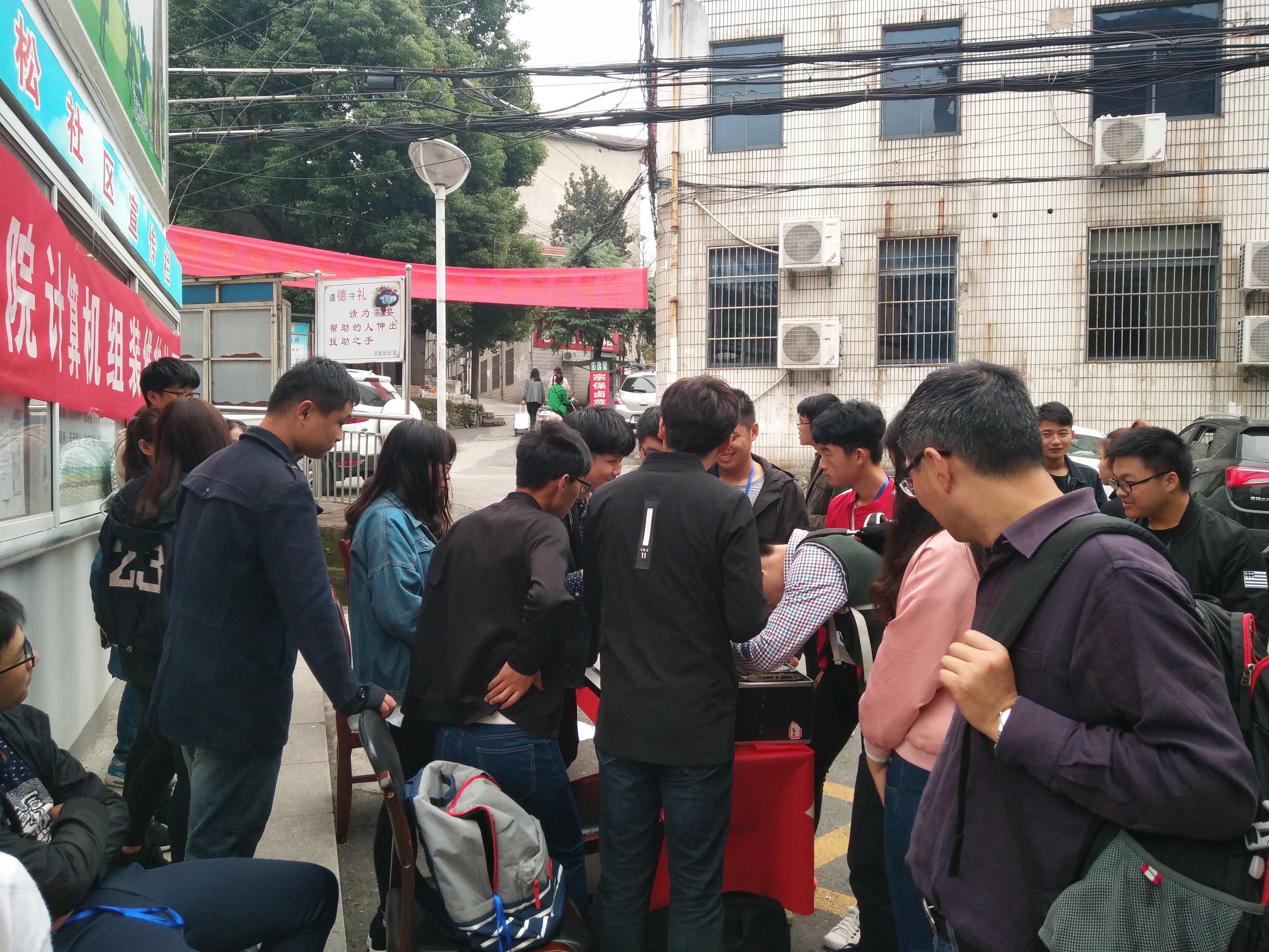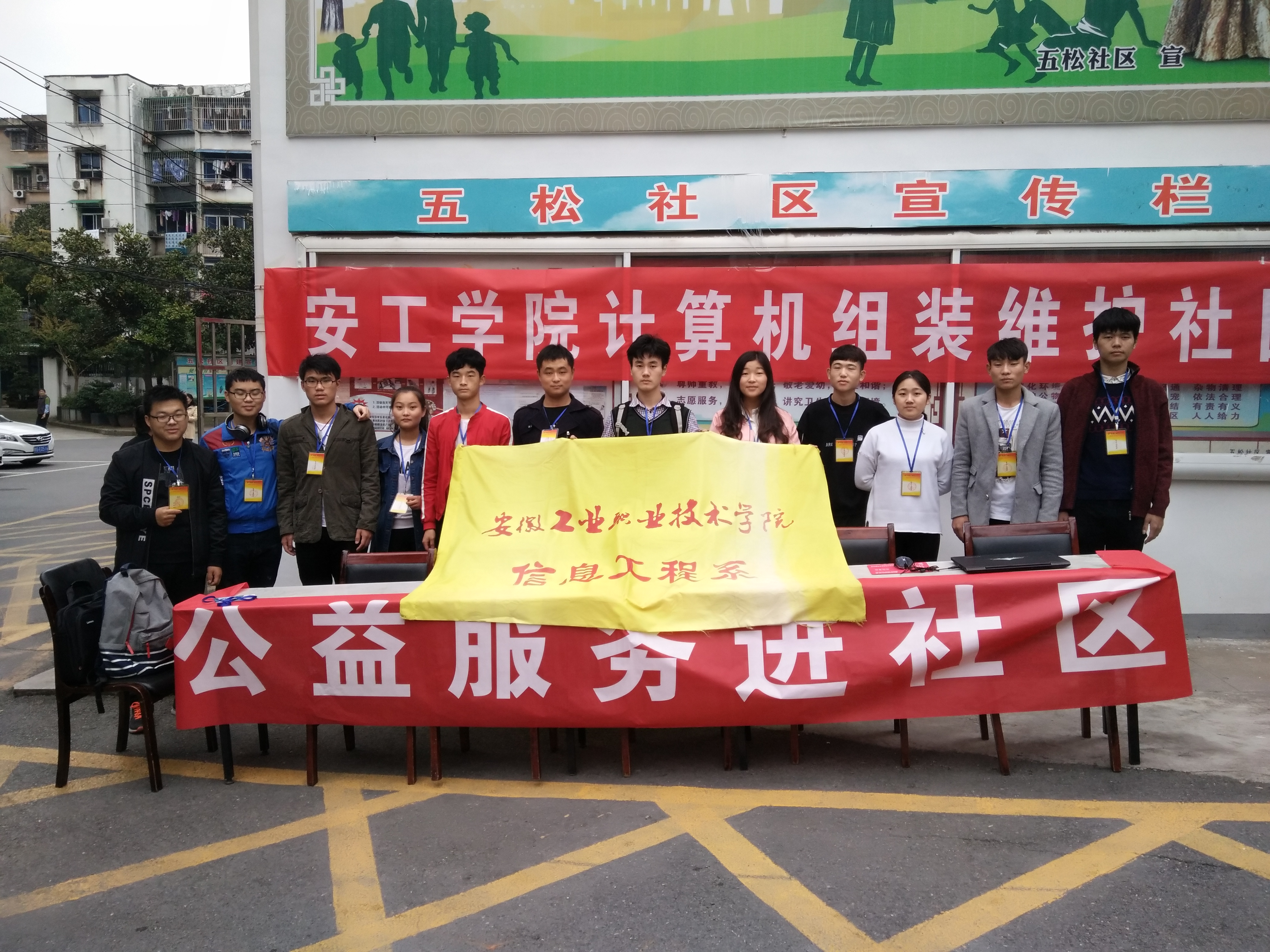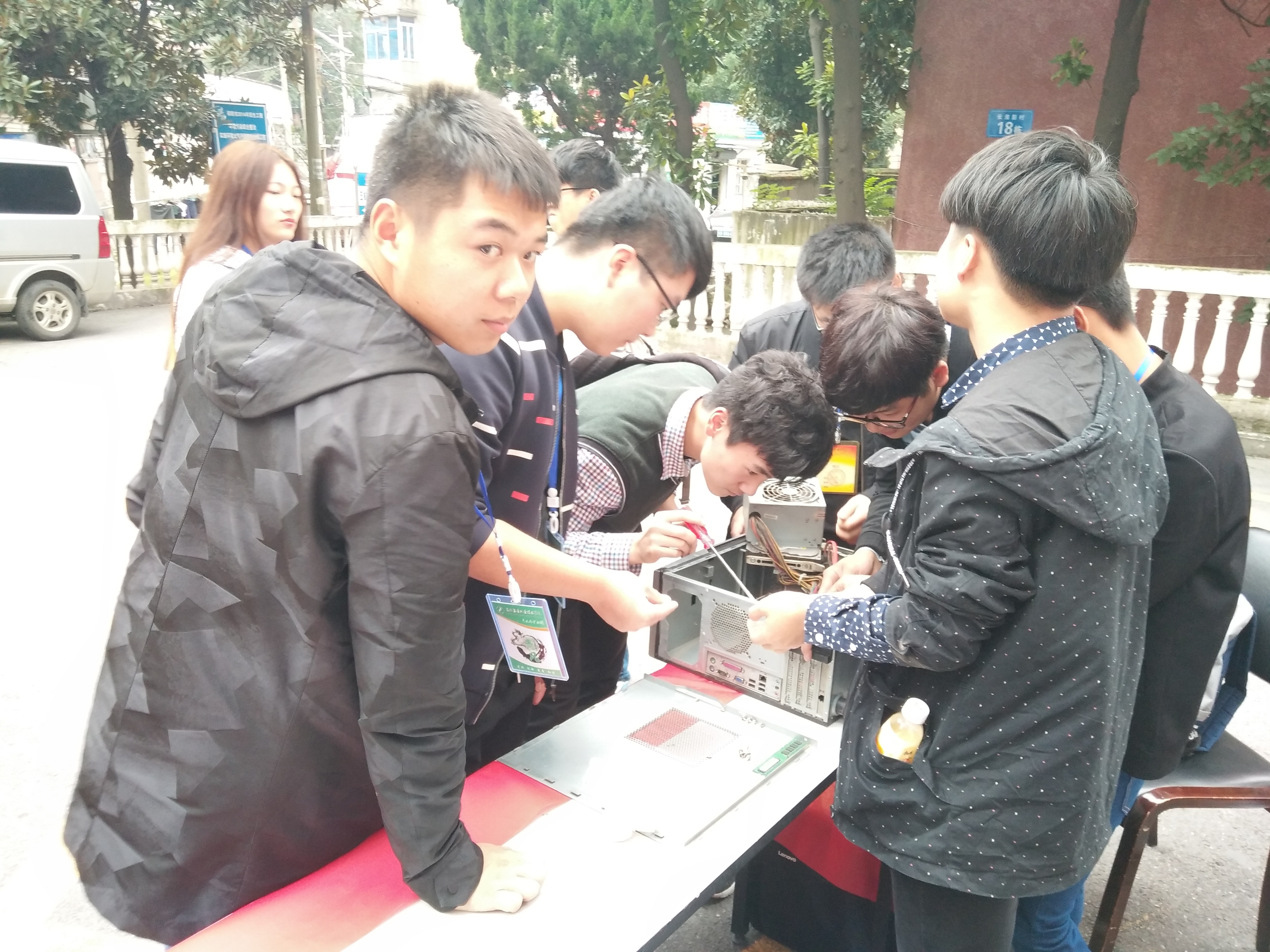 为迎接十九大的胜利召开,发挥同学们的专业特长。信息工程系计算机组装社团来到了五松社区,为居民义务维护电脑。