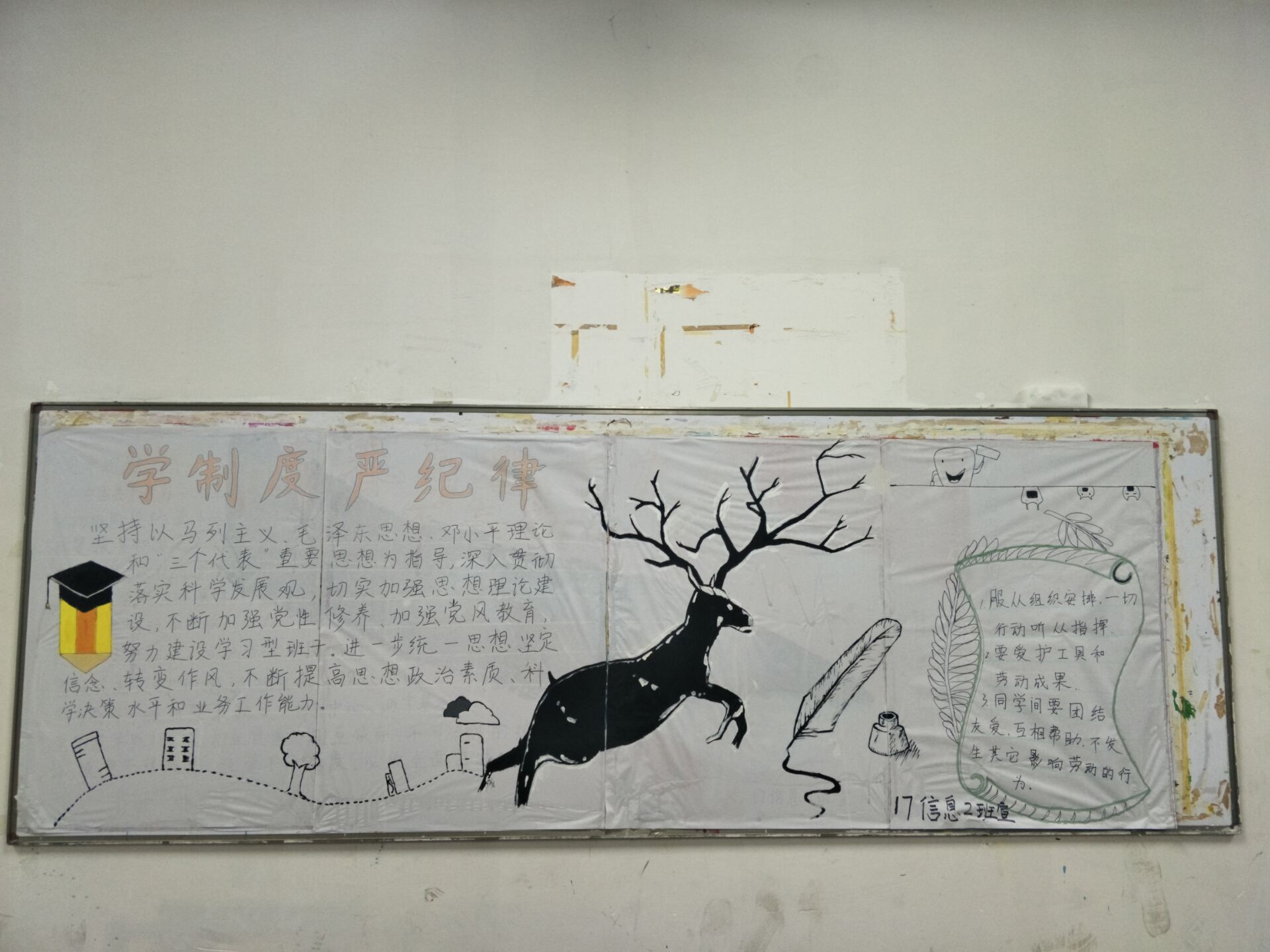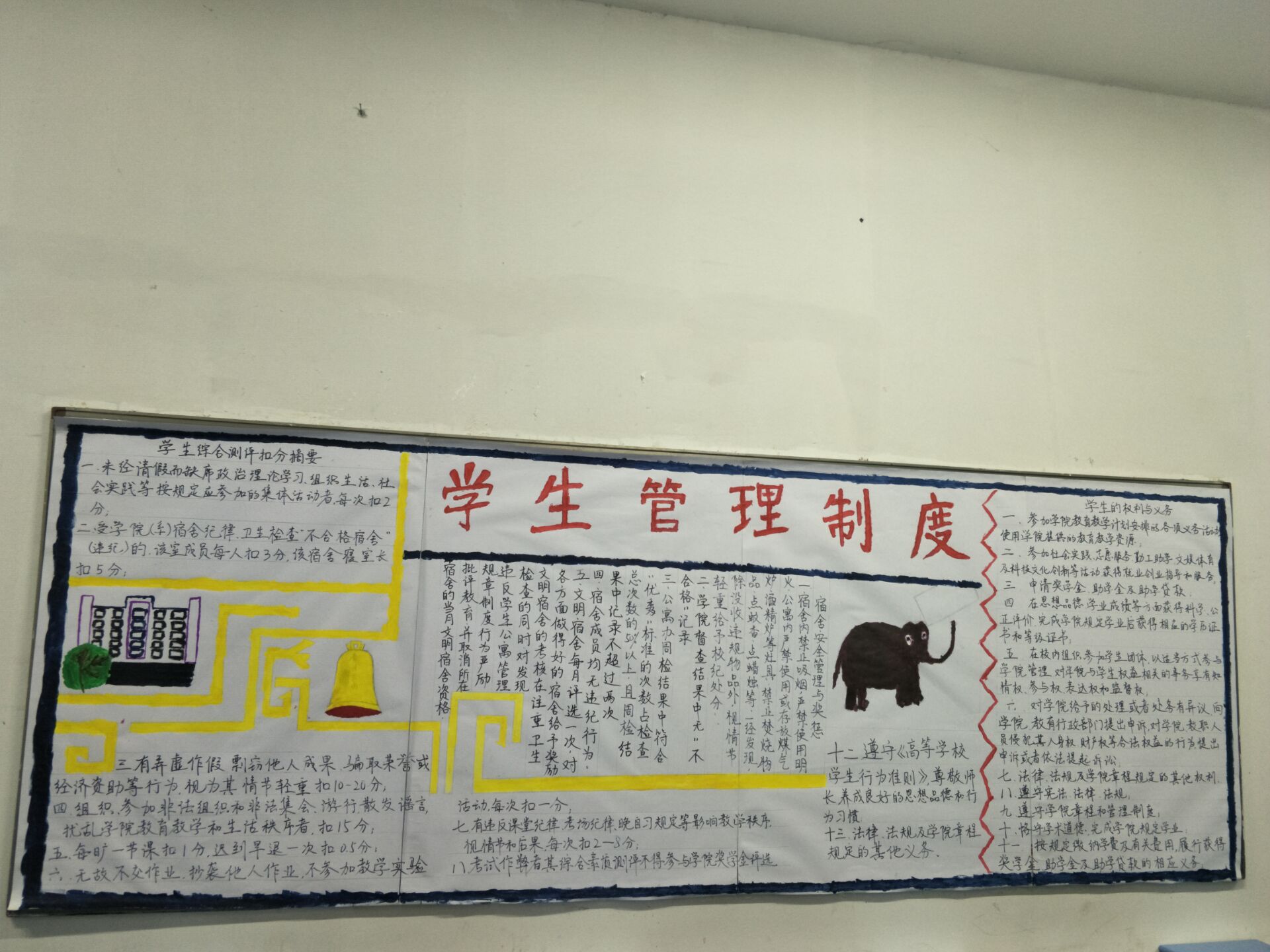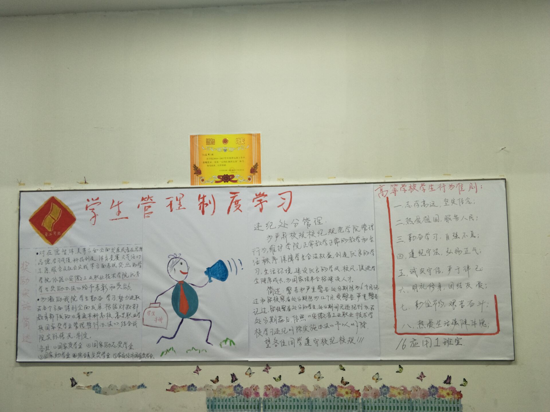 为了加强学生管理,让同学们对学校的规章制度有更深入的了解。信息系特地跟新了各班级的宣传板报。以学生管理制度为内容,让日日看、时时看,真正记在心中。