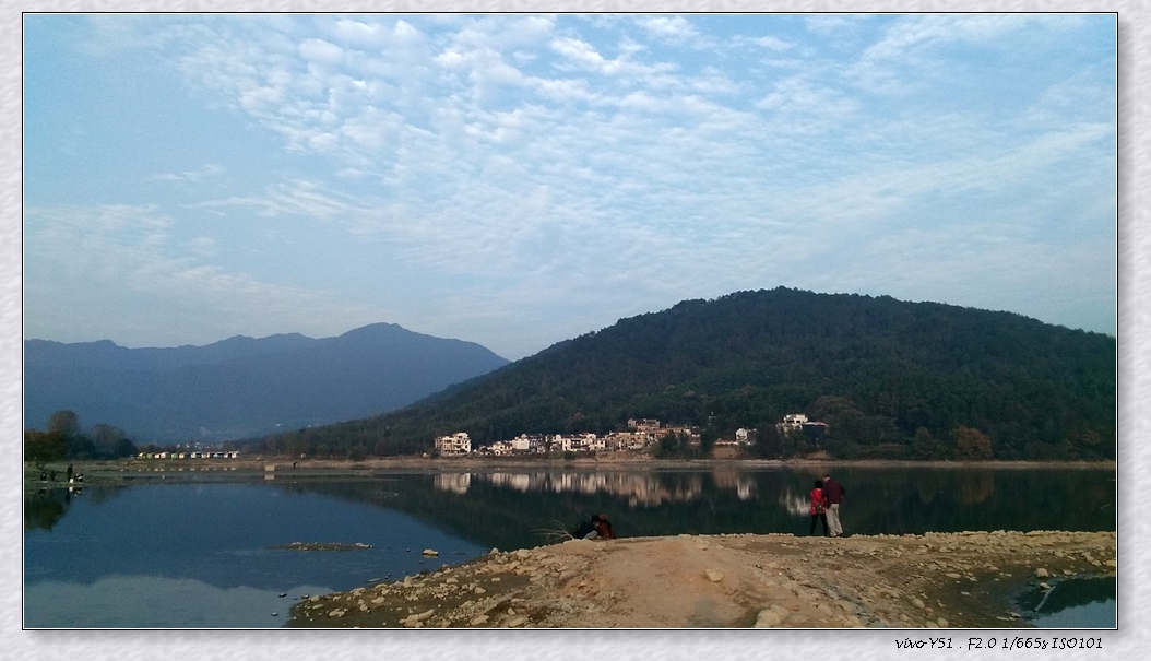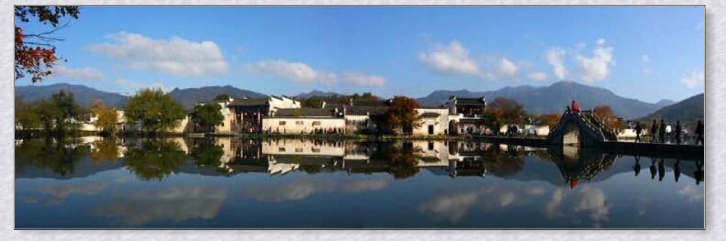 作品介绍:湛蓝的天空,平静的湖面,映射着独具魅力的宏村边缘,镜为进的谐音,意语此地是我第一次进宏村的λ置。