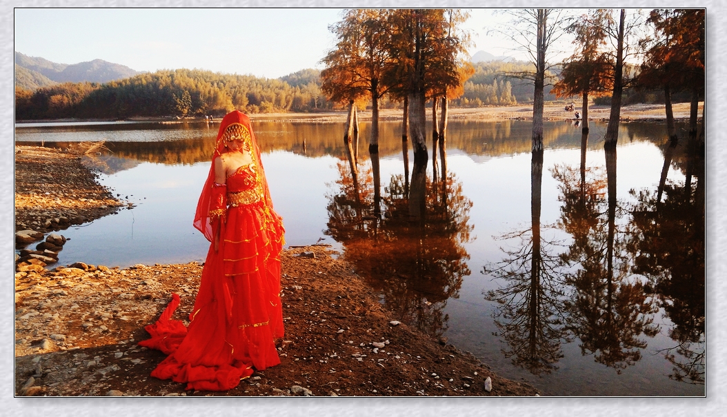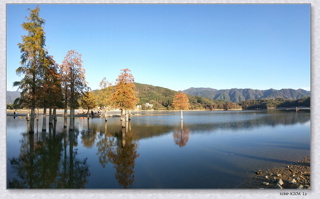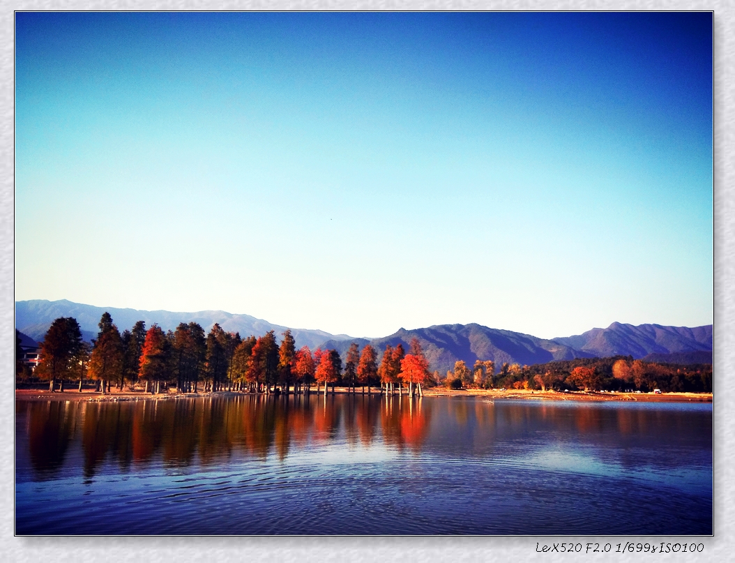 作品介绍:λ于宏村旁的小河,在村外汇成一汪湖水午后太阳西落,天空万里无云,天空和湖水旁的山以及水中的树倒影在湖水中,显得分外美丽。
