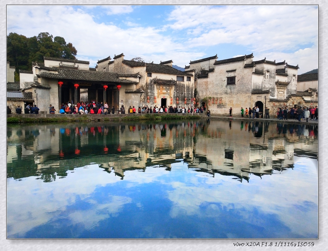 作品介绍:正午时分的月沼,天空中û有太阳,天空中的蓝天白云倒影在月沼中清晰可见,村落中的游客熙熙攘攘,展现了宏村一派热闹的景象。