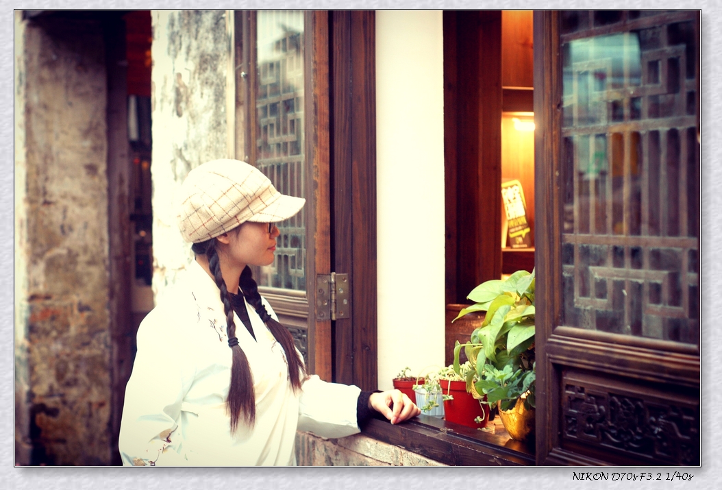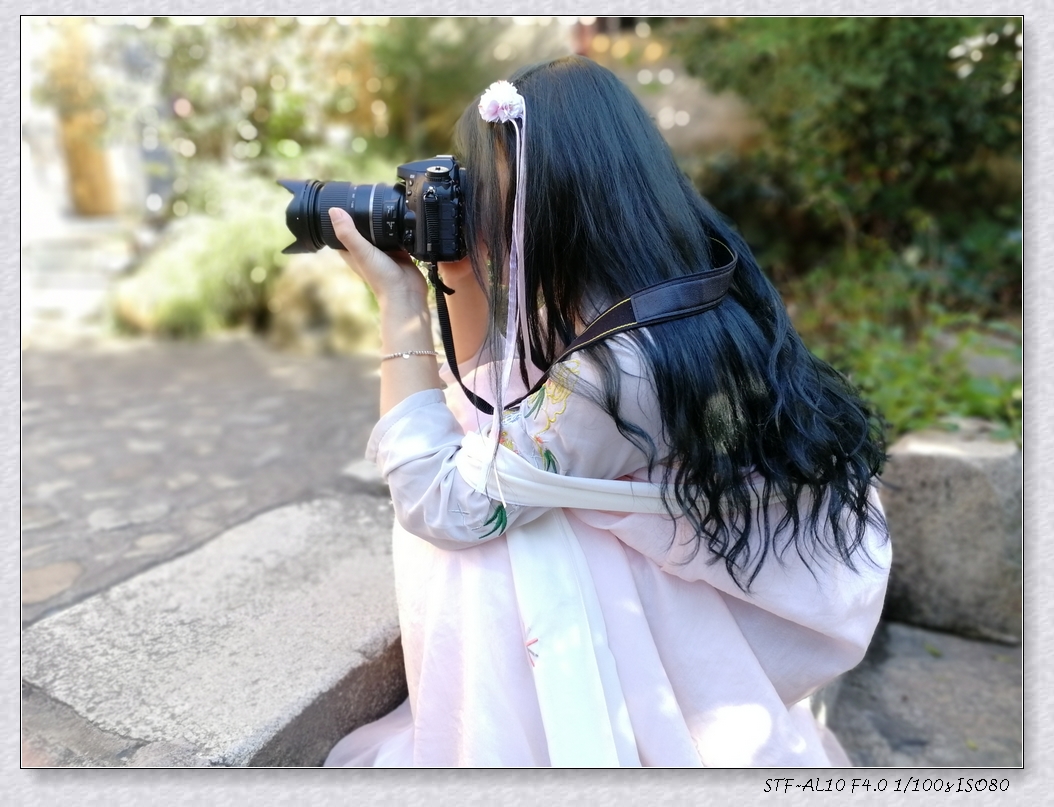 作品简介:少女身着古装,手拿相机,却充满了一种和谐之美,并且与背景想分离,充满了浑然天成的感觉。