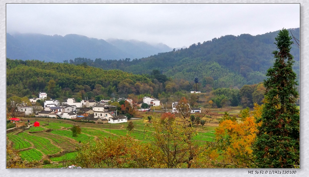 作品简介:近景是由白墙黑瓦的古村落组成,远景是由被雾气遮掩的山脉组成,使整张照片有种飘渺的感觉。