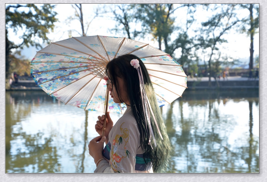 作品简介:一位仙女,撑着油纸伞,走在镜水湖边,犹如璧人一般,不敢亵渎。