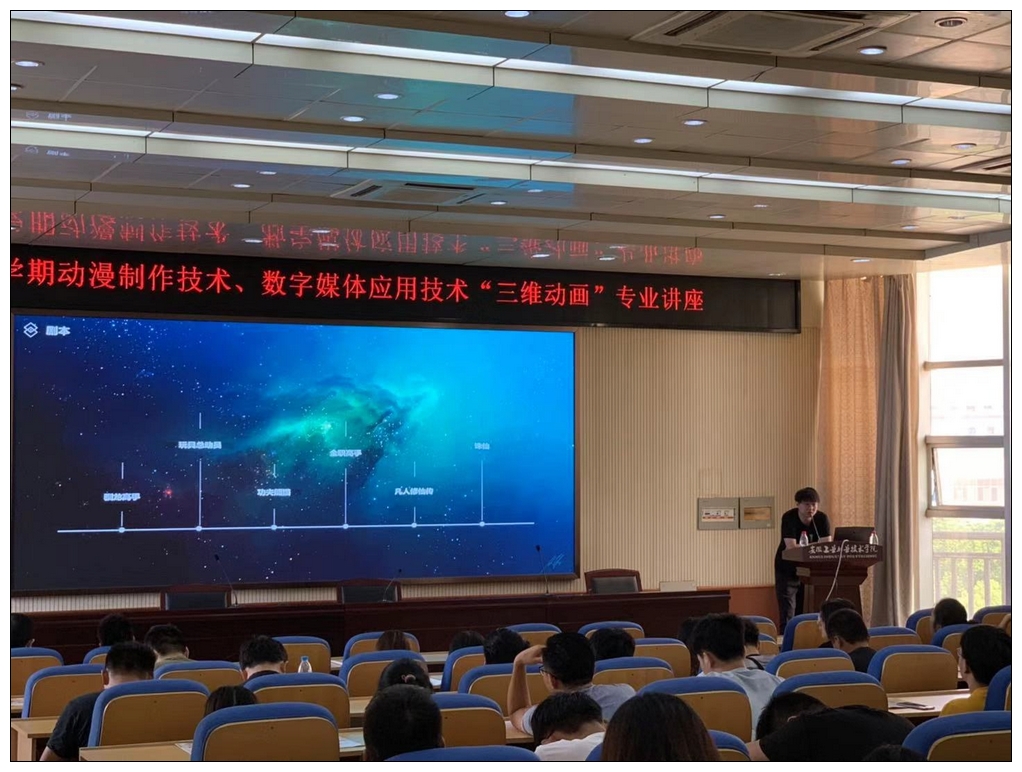 17动漫、数媒专业和艺术设计教研室全体教师参会,两个多小时的讲座,现场座无虚席,同学们展现了对新知识、新技术的渴求。陶亮等三位动画师从剧本、故事版、分镜、预演、绑定等多方面给同学们做了一场精彩的讲座。