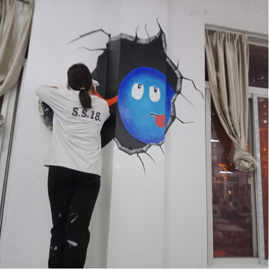 绘制进行时,社员们都拿着画笔和调色盘,小心翼翼的上色,身上都无一不是五彩斑斓的;正所谓艺术是有型的,也是无形的。在大家的努力下,白白的墙体和墙柱逐渐鲜活了起来,墙柱上的鱼儿,仿若将要游出来一般;墙体上的3D图画,异常逼真。