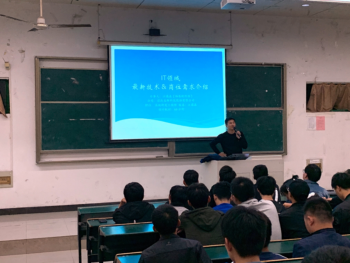 为提高教学质量、提升学生学习兴趣、指导学生更好的择业和就业、2020年10月24日晚七点、在教学楼102阶梯教室、我系邀请合肥宜品生鲜科技股份有限公司高级研发工程师、项目组长江谋晶先生来本校开展互联网与软件公司最新技术、岗位需求介绍。参与讲座的有18、19软件技术专业和计算机应用专业200余位学生。