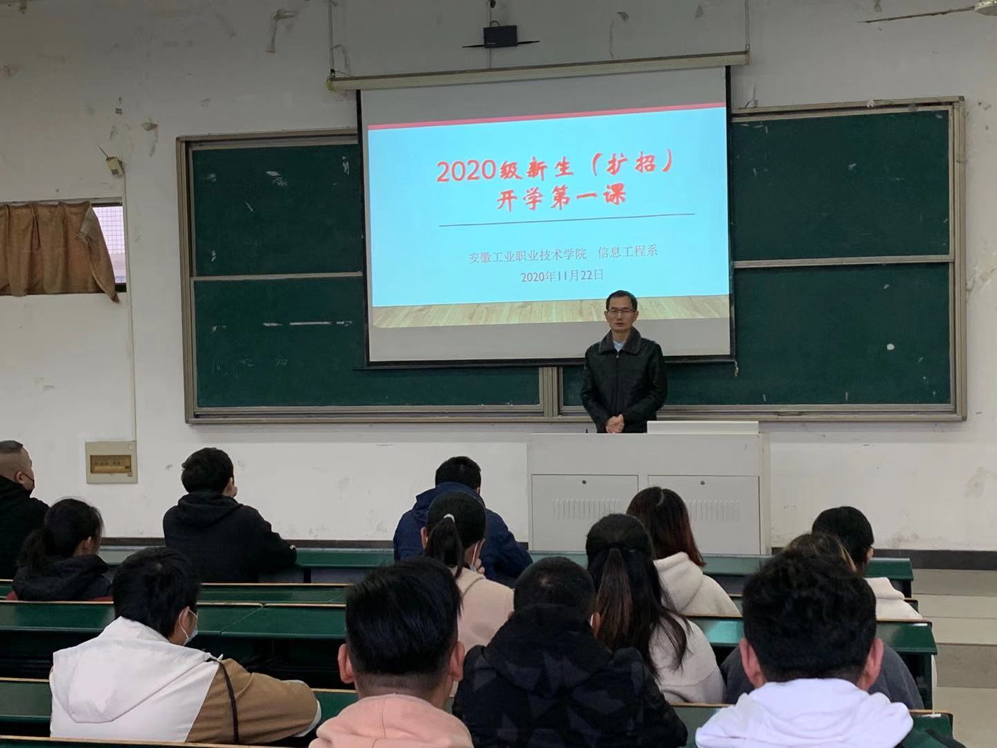 信息工程系于2020年11月22上午八点在教学楼阶梯102教室召开了2020级社会扩招新生开学第一课。信息工程系书记、主任、各专业带头人、任课教师及扩招班级辅导员和全体社会扩招同学参加了此次大会。