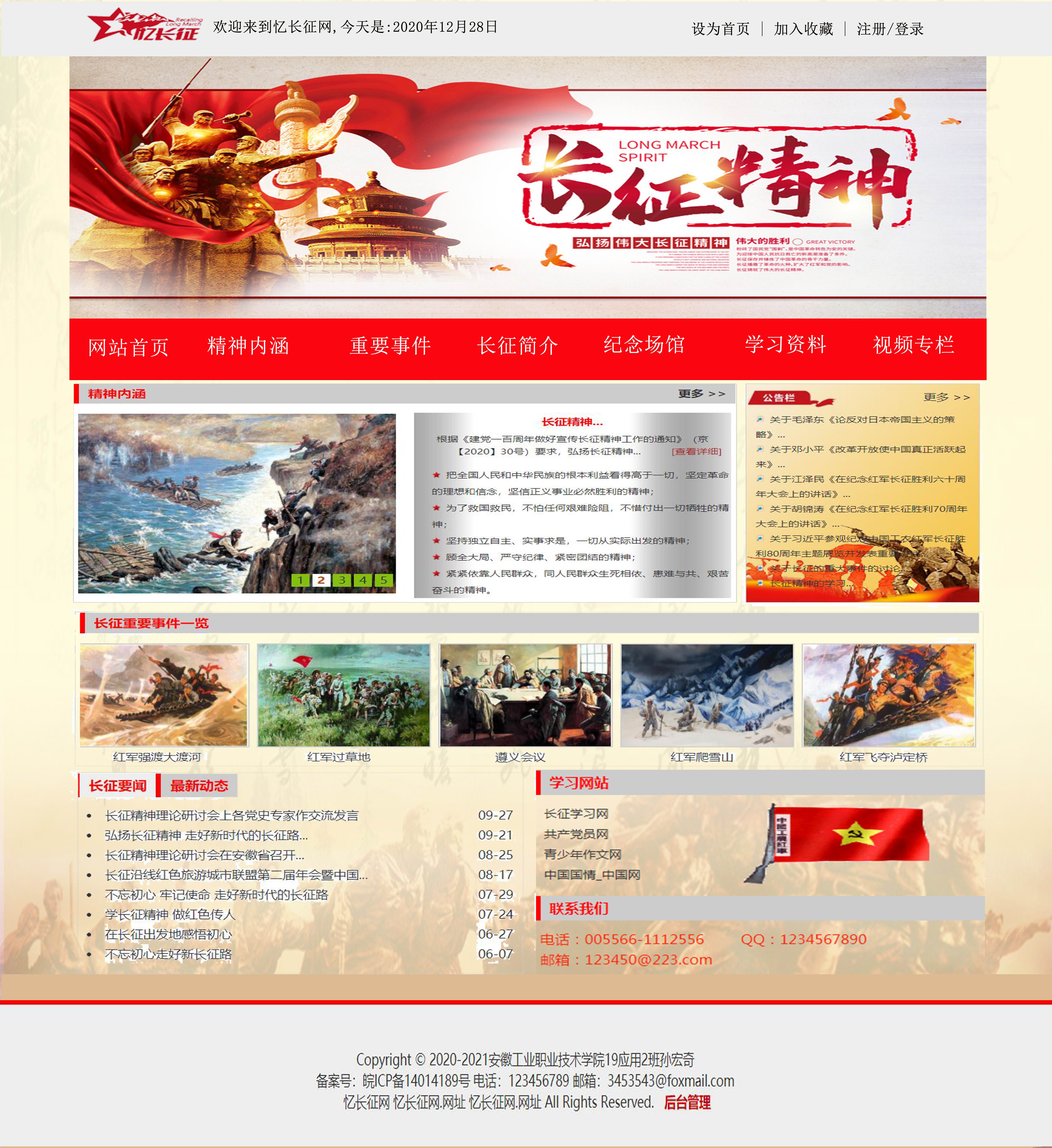 为迎接中国共产党建党100周年,2021年1月8日信息工程系以“党的伟大精神”为主题举办了2020年秋季学期“静态网页设计”竞赛。本次竞赛旨在大力弘扬党的伟大精神,引领学生树立爱党爱国的民族精神,在中华民族的伟大复兴的历史进程中以青春报效祖国,用技能成就人生。也通过这个竞赛检验相关专业课程的学习效果,提高网页设计的实战动手能力,包括图形图像处理能力、网页版式与色彩搭配能力、页面布局能力、WEB前台的JS编程能力等;使同学们能将所学专业技能与社会需求更紧密结合,增强同学们的就业竞争能力。