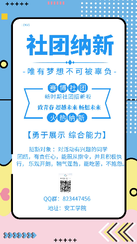 本次活动是21 级学生入校后组织大二同学们通过PS制作的纳新海报。在大学校园里,社团它象征着理想、青春、拼搏与活力,而我们就从2021社团纳新活动着手,通过这个活动来表达对新入校的新活力表达欢迎,也为我们的社团注入一支生命力更加旺盛的新鲜血液。
