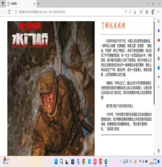 为了缅怀抗美援朝英勇的志愿军先烈,弘扬和继承伟大的抗美援朝精神,激发学院学子的爱国热情,与学习不怕苦不怕累的伟大精神,赛博网络社团举办抗美援朝网页设计活动。