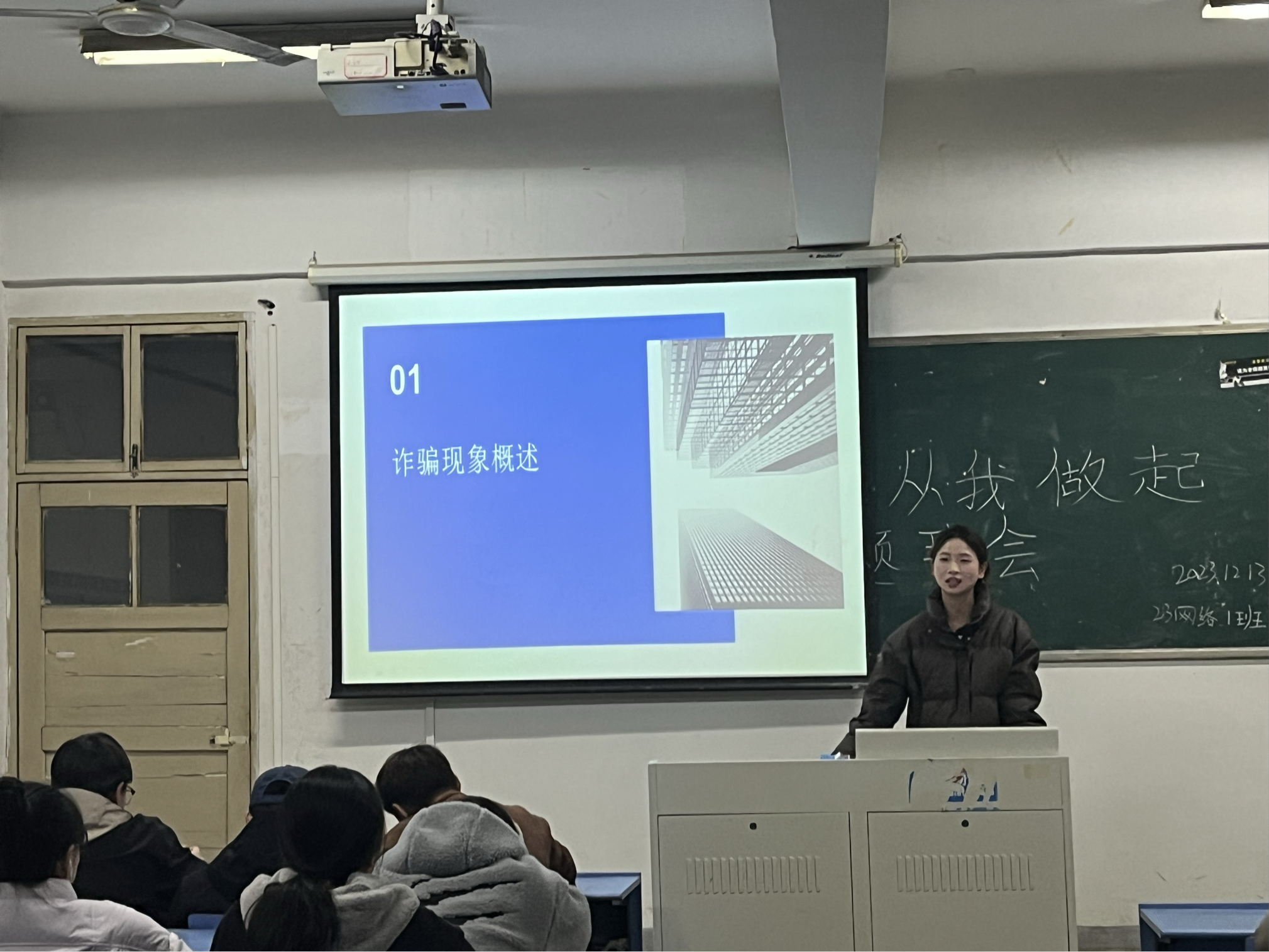 为进一步增强学生反诈防骗意识,营造校园反诈防骗的浓厚氛围,提高学生反诈防骗应对能力。12月13日,信息工程系安排反诈宣讲团成员在23级各班开展“校园无诈青春共成长,和谐美好安全你我他”主题宣讲活动。