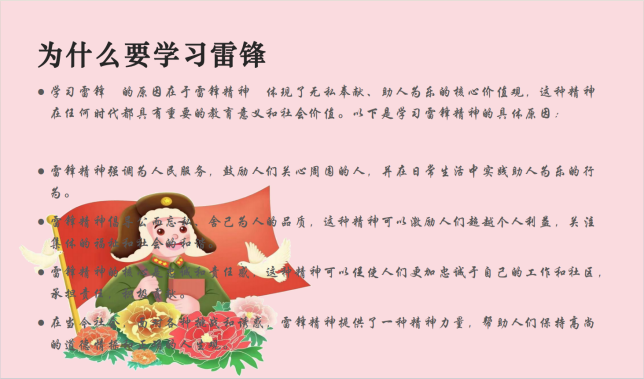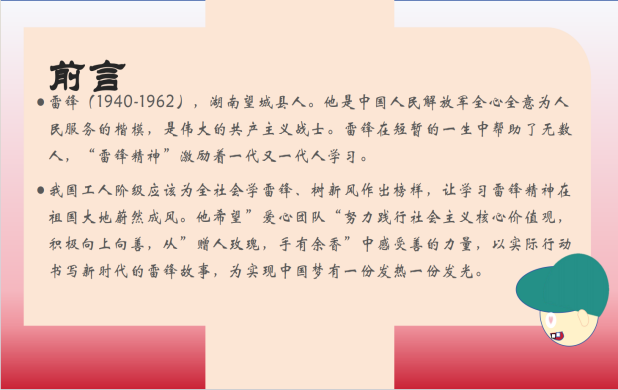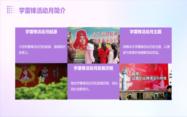 此次活动中,同学们运用自己所学的知识、积极去收集雷锋的相关内容、材料背景、图片等,用ppt相关的专业技能相结合。此次活动让同学们更好的了解了雷锋的事迹,将乐于助人的精神传递了下去,同时也激励着同学们学习爱国精神。