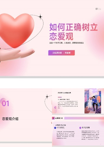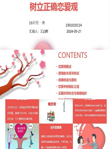 此次活动,同学们通过网上查阅资料,阅读相关书籍,了解关于正确恋爱观的相关知识,并将自己了解的关于恋爱观知识以PPT的形式呈现出来。在制作期间,同学们选择了精美的封面,运用各种动画展示内容,有的添加了背景音乐和视频讲解,将知识生动形象地展现出来,让阅读的人一目了然。