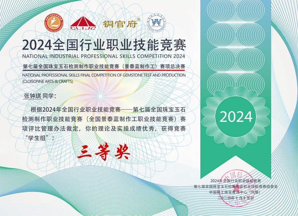 在9月份刚刚结束的全国行业职业技能竞赛景泰蓝制作工赛项总决赛中,信息工程系师生凭借精湛的景泰蓝制作技艺,获得优异成绩。程方茹老师获得职工组铜奖,23广告班张钟琪同学获得学生组三等奖,23广告班的傅小柔和骆文雅同学获得新星奖。这一成绩不仅为我校赢得了荣誉,也为传统工艺的传承与发展做出了贡献。