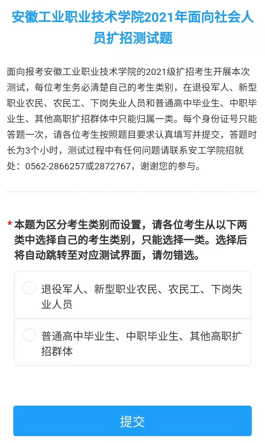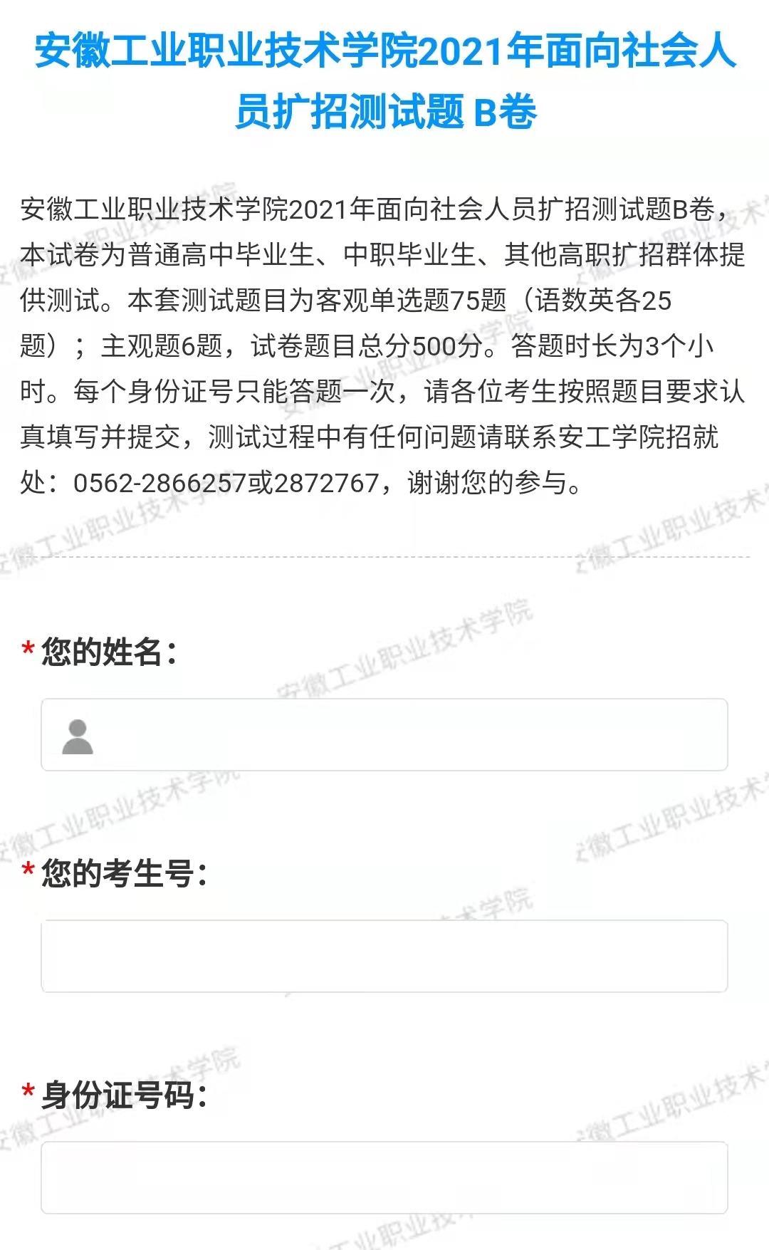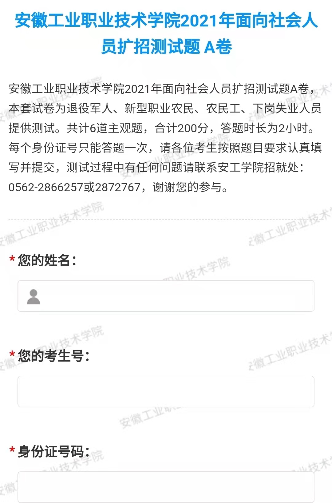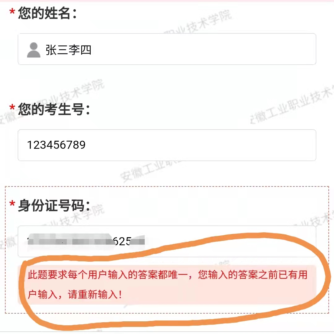 每个身份证号只能提交一次(若已提交过一次,则再次答题时会显示身份证重复,需要重新输入新的身份证信息,见下图),请各位考生按照题目要求认真填写并提交,测试过程中有任何问题请联系安工学院招就处:0562-2866257或2872767,谢谢您的参与。
