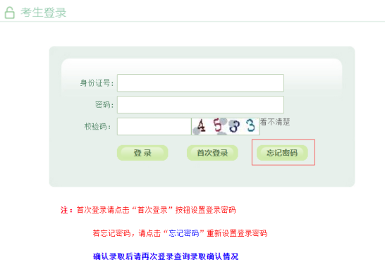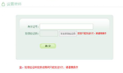 输入考生号,身份证号,点击“发送短信验证码”按钮后,系统会随机发送6位数字验证码至考生报名时所填的手机号上;填写完短信验证码,点击“确定”,跳转至考生修改密码页面,设置考生登录密码。切勿将短信验证码告知无关人员。