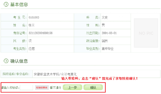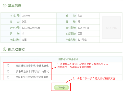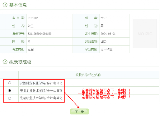 特别提醒:高职扩招录取确认只有在规定时间内(10月11日-12日),在规定网站(gkbm.ahzsks.cn)上操作方为有效。请各位考生一定要妥善保管自己的考生号、身份证号等个人信息,切勿泄露给其他人,更不要委托他人代替自己确认。一旦确认了录取院校,是不能修改的!!!