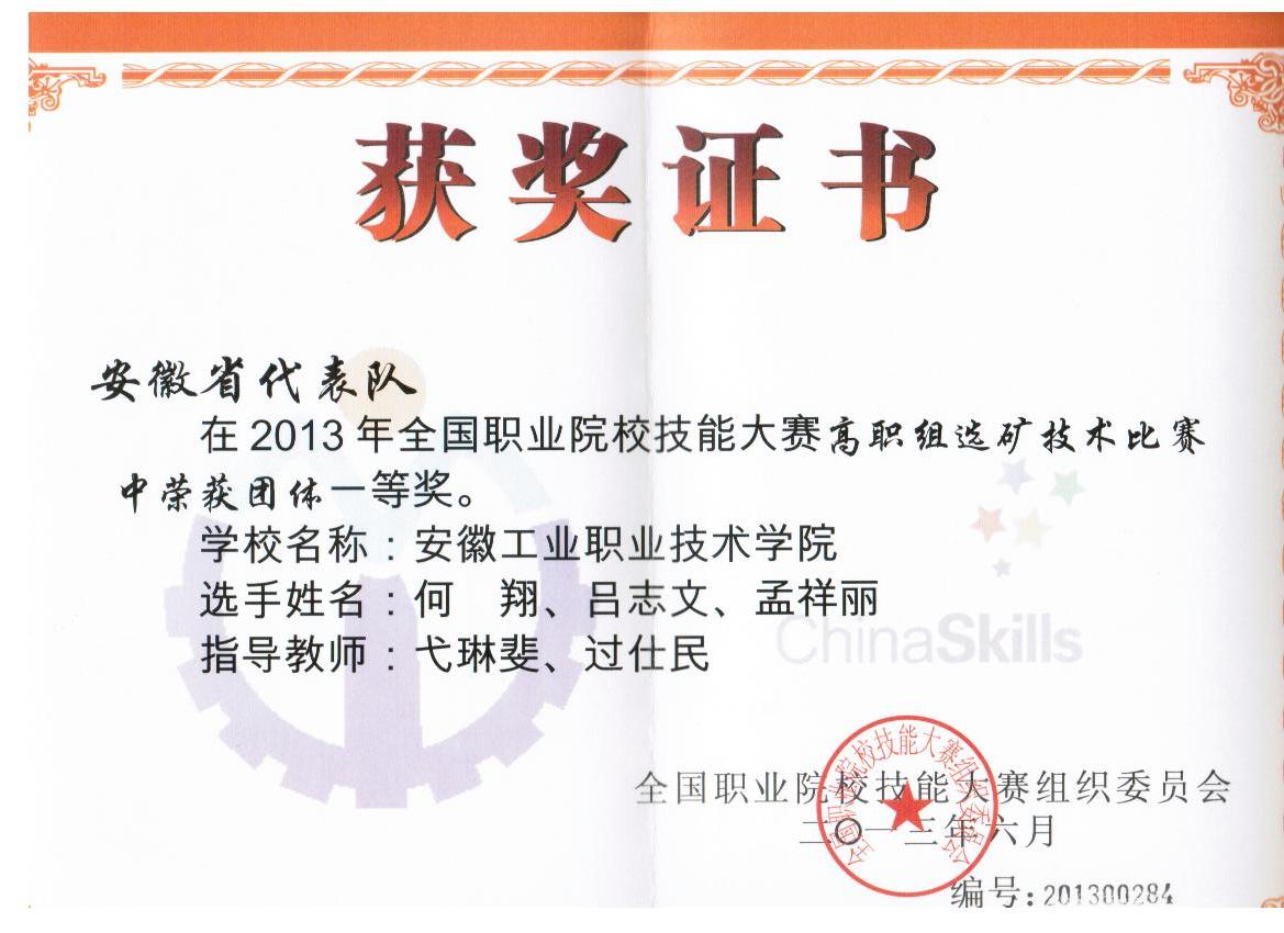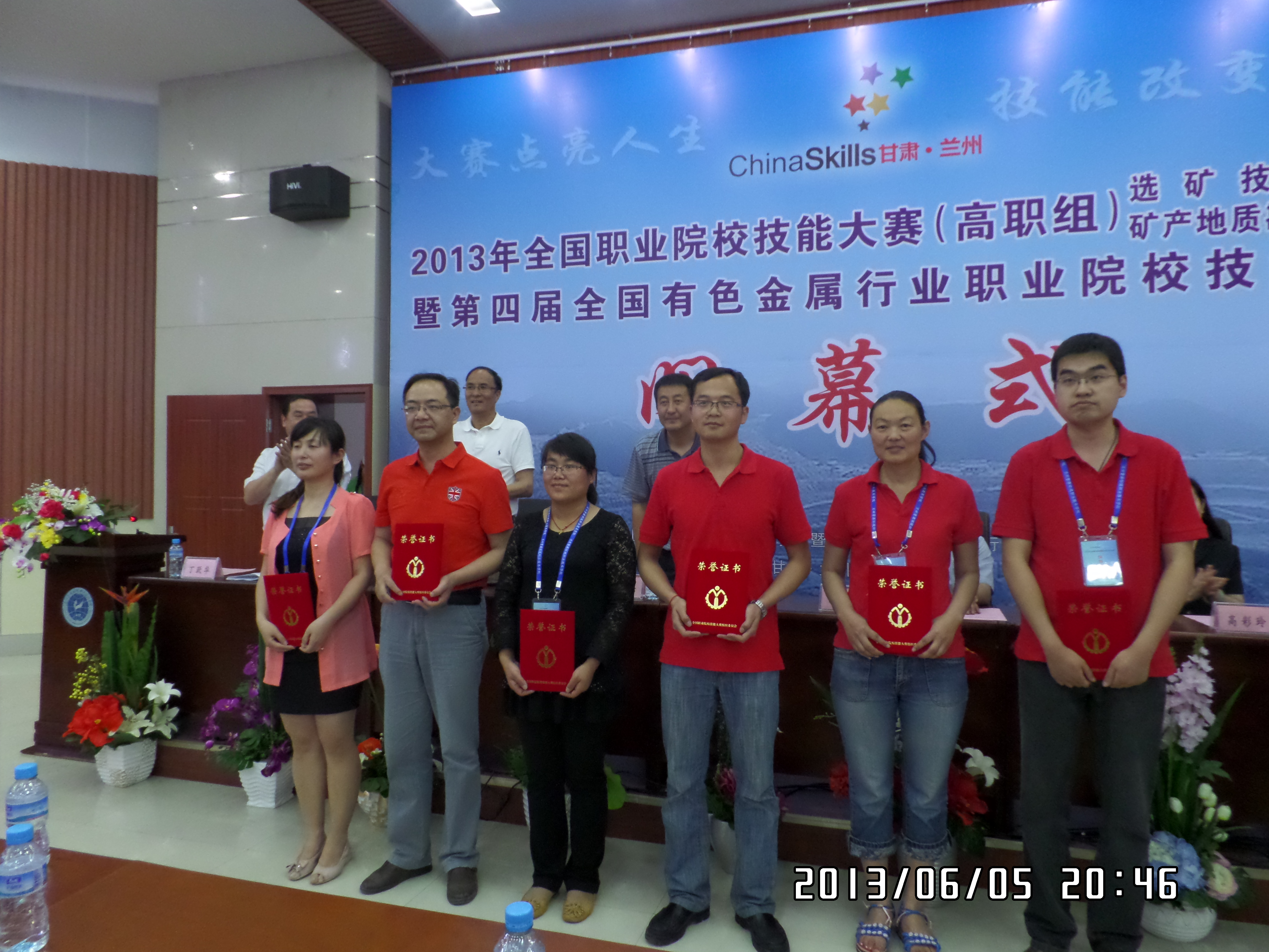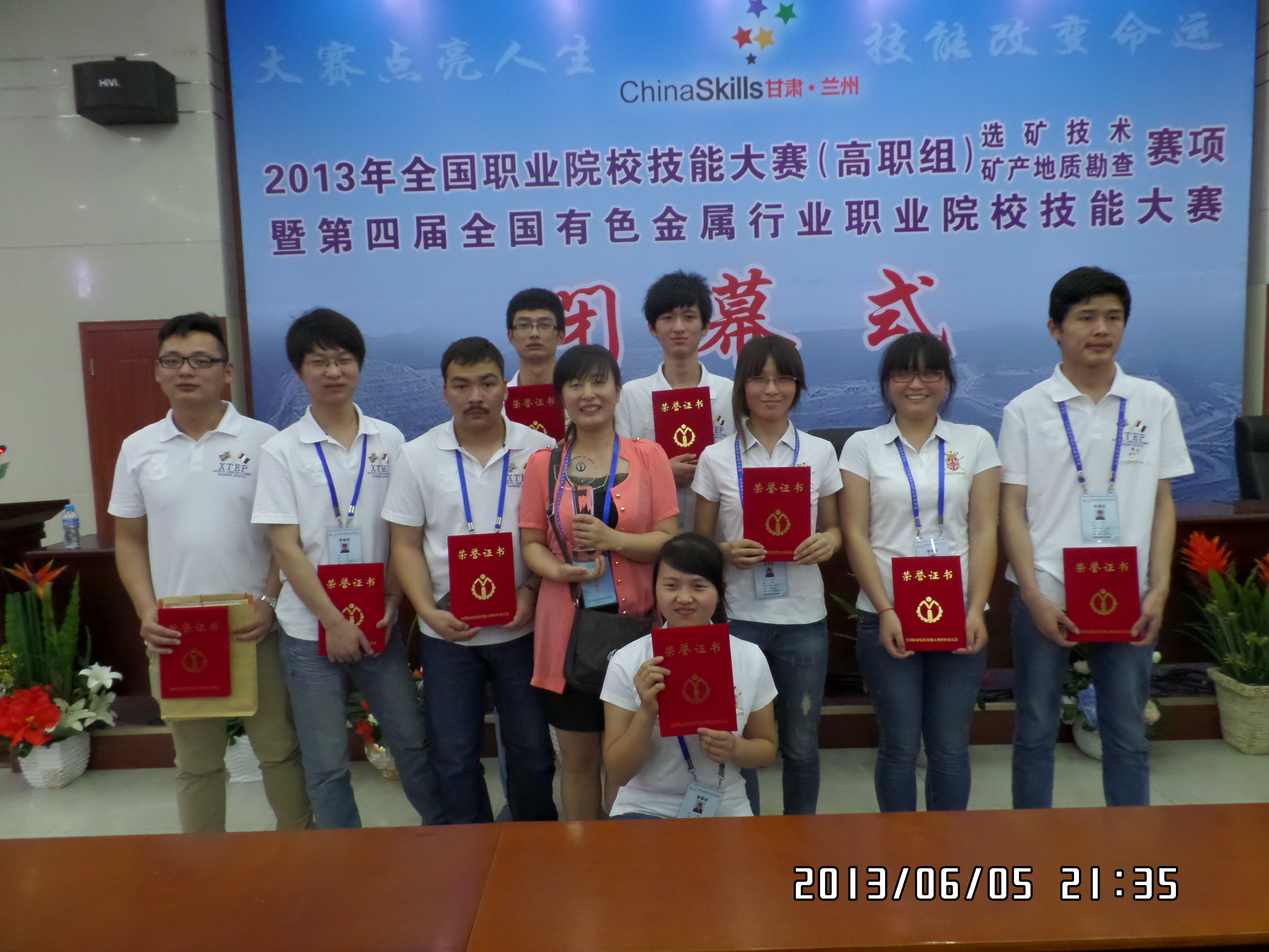 2013年6月4日至5日,在甘肃兰州举行的第四届有色行业职业院校学生技能大赛中,由beat365过仕民老师和弋琳斐老师指导的十二位同学组成的beat365官方网站代表队选手喜获佳绩,共获得一个一等奖、两个三等奖。获奖选手均来自beat365资源开发系11选矿班,其中孟祥丽、何翔、吕志文获团体一等奖,周如来、査朝阳、亓婷和李政、艾比布拉·巴克、周颖分别获团体三等奖,同时学院过仕民、弋琳斐两位老师获得大赛优秀指导老师称号。